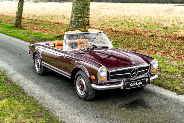 - La Mercedes-Benz 280SL Pagode, modèle vintage et emblématique des années 1960, connu pour son design élégant et sa conduite agréable.