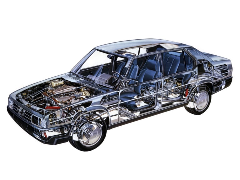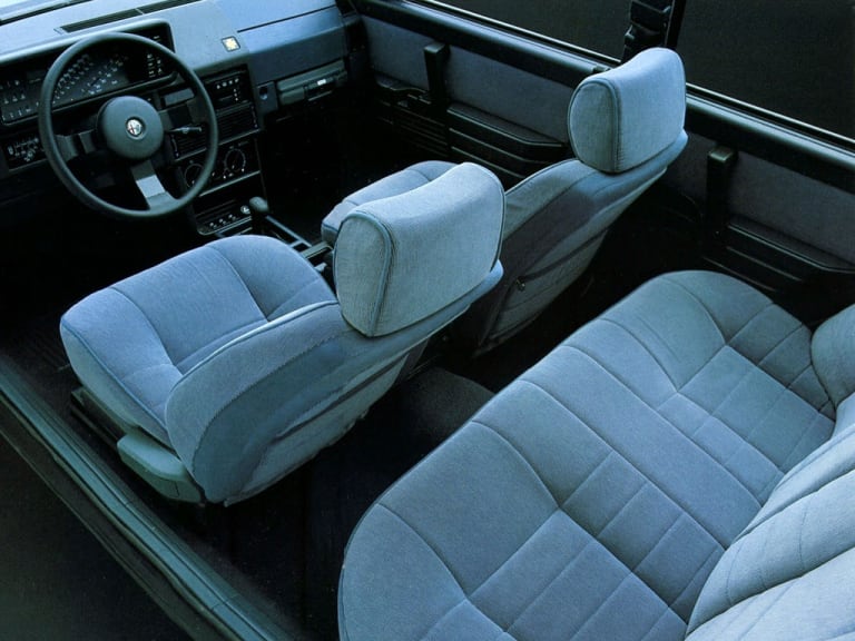 Vivent les maths donc ! La géométrie, en particulier. En témoignent les lignes pour le moins tendues dues à Bertone, qui décline cubes et parallélépipèdes à tous les étages. Un peu d’adoucissant quand même ? Phares et calandre seront légèrement retouchés lors du maigre restylage de 1986. Pour soulager une ligne équilibrée mais peu originale, les designers ont inséré une moulure en négatif sur toute la ceinture de caisse ainsi que deux grandes rainures sur le capot. Le résultat « fait moderne » et l’aérodynamique progresse – Cx de 0,37, en baisse de 10% – , sans pour autant rejoindre la fluidité d’une Audi 100. De série sur tous les modèles et exclusivité mondiale – comme l’attaché case intégré –, le spoiler, activé par des pistons à gaz, se déploie en fonction de la vitesse et optimise stabilité, pénétration dans l’air et refroidissement du moteur. La robe s’éloigne donc des courbes sexy des Alfetta ou Giulietta. Parfois pour le pire.