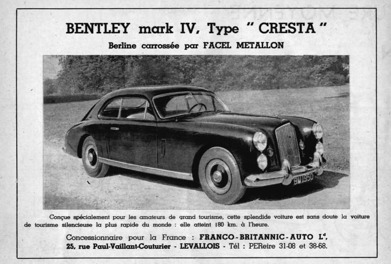 Aujourd’hui, voici l’histoire d’une Bentley fabriquée en France, dessinée par un Italien et qui d’une certaine manière inspirera la création d’une marque d’automobiles de luxe française. Car Rome ne s’est pas faite en un jour, et Facel-Vega non plus. Il aura fallu passer par un certain nombre d’étapes avant de voir émerger cette nouvelle marque française et la présentation de la Véga en juillet 1954. Cette Bentley s’appelle la Cresta, et son évolution, la Cresta II préfigure le futur de Facel (à l’époque Facel Métallon).
