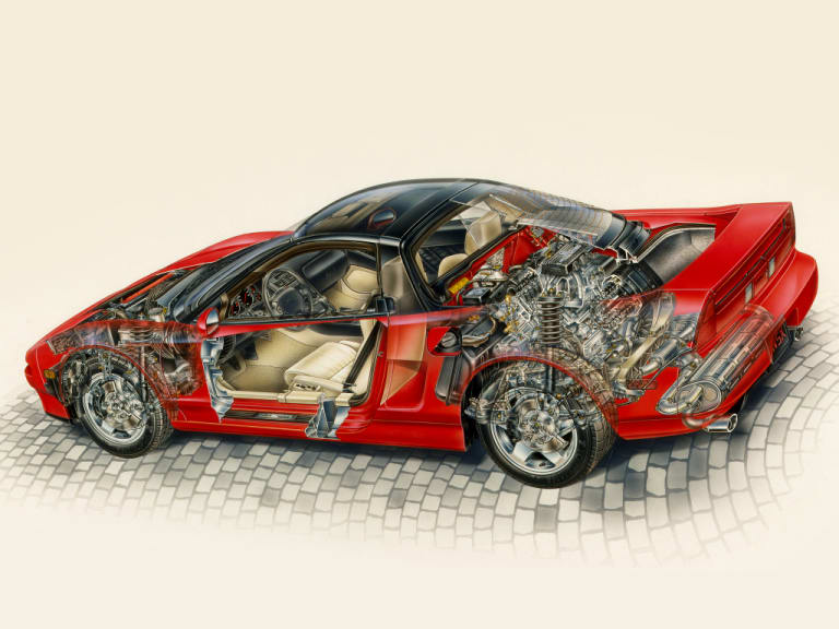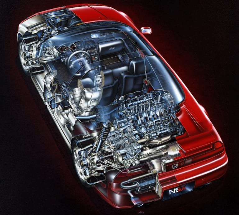 Le développement de la NS-X (qui prendra par la suite le nom commercial de NSX) commença à partir de 1985. Il fut rapidement décidé que la future voiture serait un démonstrateur technologique, aussi bien d’un point de vue moteur que châssis ou suspensions ! A la place du C20A qui ne donnait pas tout à fait satisfaction, Honda préféra créer ex-nihilo un V6, le C30A, doté de la technologie VTEC, en aluminium et dont les bielles étaient en titane. Ce nouveau moteur de 3 litres développait la puissance de 270 chevaux permettant de respecter l’accord tacite de limitation de la puissance au Japon (lire aussi : The Japanese Gentleman’s agreement). Cela paraît peu aujourd’hui, mais à l’époque c’était une belle puissance : la Ferrari 328 offrait exactement le même nombre de canassons, tandis qu’une Porsche 911 Carrera 4 « 964 » n’en proposait que 250.
