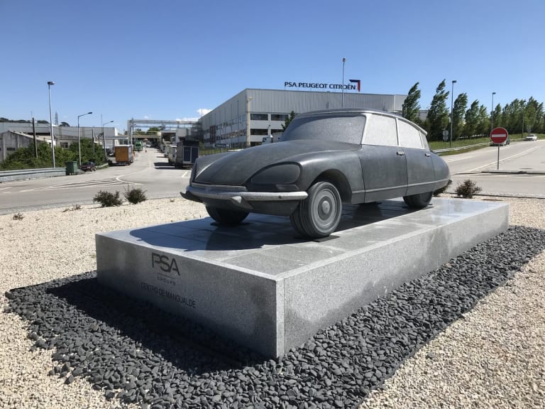 A l’entrée de l’usine de Mangualde trône, depuis 2016, une DS « boca de sapo » en pierre. Toute la gamme Citroën produite au Portugal