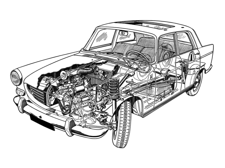 D’habitude prudente, la famille Peugeot va donc se préparer à l’offensive du chevron en prenant le contre-pied. Pourtant, la tentation est grande de suivre Citroën dans la surenchère technologique au point de réfléchir à la suspension oléopneumatique, voire à un V8. Rapidement, la stratégie va apparaître évidente. Pas besoin de grandes études marketing pour comprendre que la clientèle Peugeot est assez conservatrice. D’ailleurs, les soucis des débuts de la DS confirment qu’il vaut mieux rester prudent.