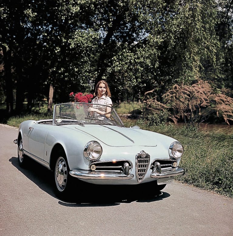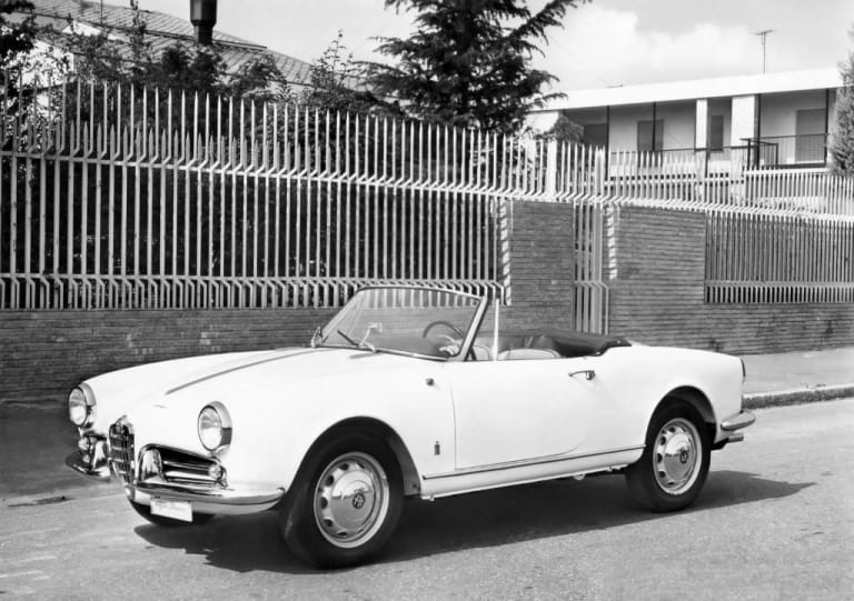 A l’origine de ce petit cabriolet doté d’un petit 4 cylindres 1,3 litre développant 80 chevaux (puis une version Veloce de 90 chevaux), on trouve le désormais célèbre importateur américain Max Hoffman à qui l’on doit aussi la Mercedes 300 SL “Gullwing”. Récupérant l’importation d’Alfa aux USA, il suggère la création d’un petit cabriolet sur la base de la Giulietta. Ainsi, le Spider cible-t-il clairement les Etats-Unis mais s’avère un succès aussi en Europe, s’installant comme un concurrent crédible aux roadsters anglais.