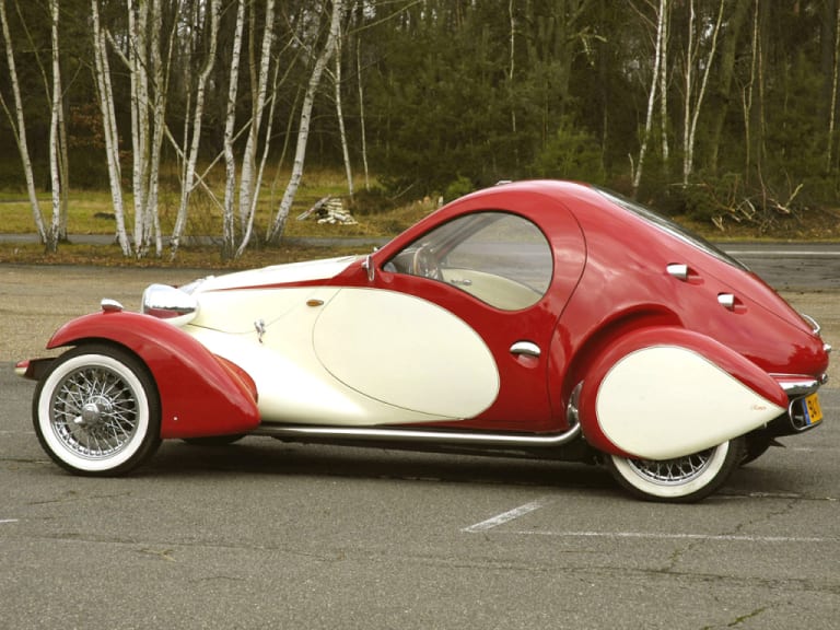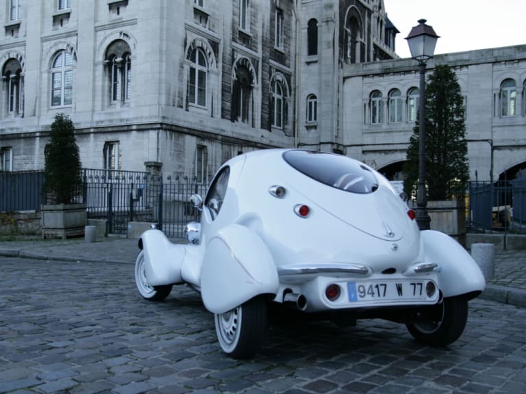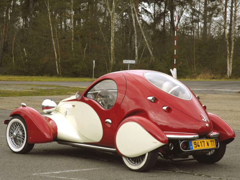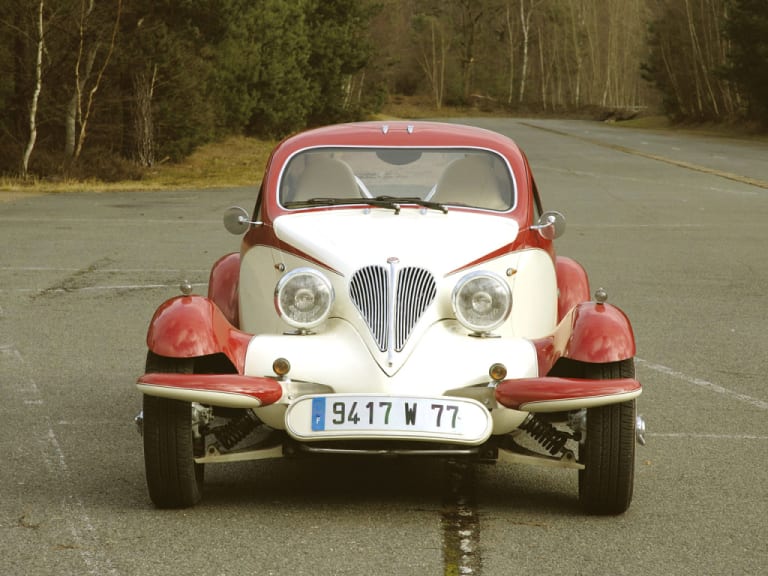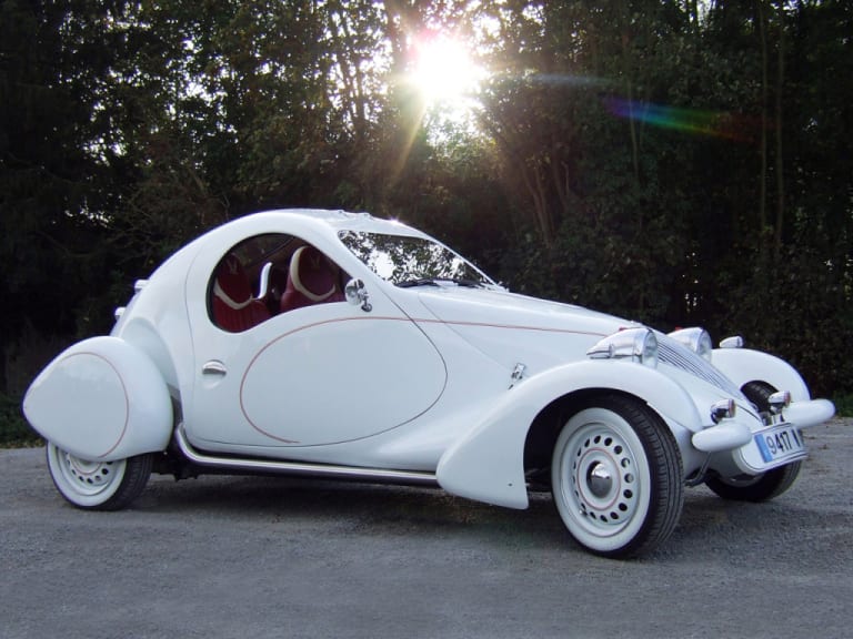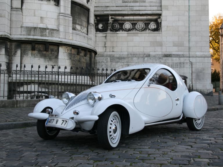 Il faut dire que la première apparition de cette étonnante Rumen date du salon de Francfort, en 2002. Il s’agissait déjà d’une improbable évocation d’une Type 57 selon son auteur, Roumen Antonov, un bulgare exilé en France depuis 1988 (entre autres pays, on le verra). A l’époque, la base était celle d’une Smart, avec des trains roulants avant de Citroën 2CV, mais l’étrange design était déjà là, avec ce capot avant doté d’une calandre et d’ouïes d’aération alors que le moteur est à l’arrière. Peu importe.