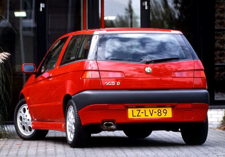 Énième dérivé de la Fiat Tipo, la 145 ne ressemblait pourtant pas du tout à sa matrice et se présentait sous la forme d’un coach 3 portes que ses volumes rapprochaient, sous certains angles, d’un « coupé-break ». Dus au crayon de Chris Bangle, le traitement singulier des vitrages de la partie arrière, la poupe presque verticale, la ligne plongeant résolument vers l’avant, marquée par un « coup de gouge » reliant sans coup férir les projecteurs aux feux arrière, le décrochement inusité de la portière et, enfin, la calandre en « bec d’aigle » – tout cela constituait un long inventaire destiné à ratifier la personnalité de l’engin et, par ricochet, celle de ses heureux conducteurs. Enfin, heureux, c’est peut-être vite dit, car les concepteurs de la 145, dont la mission consistait à faire taire les esprits persifleurs ne ratant pas une occasion de moquer les bagnoles italiennes (leur finition bâclée, leur électricité fantaisiste et leur propension à rouiller avant même d’avoir quitté l’usine), n’avaient pas lésiné sur la qualité. Résultat : par rapport à une 33 1.7 16v, la 145 semblablement motorisée pesait 200 kilos de plus, une surcharge pondérale qui mettait littéralement à genoux le légendaire boxer de Pomigliano d’Arco !