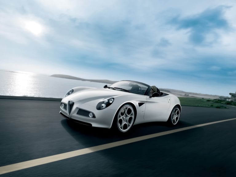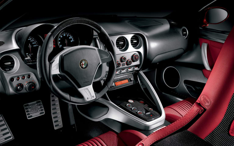 La plupart des gens l’ont oublié, mais c’est ce même groupe Fiat qui, à l’époque de sa splendeur et bien avant Volkswagen, a le premier mis en œuvre une stratégie de déclinaison de plateformes aux habillages spécifiques selon les marques de son portefeuille. Toutes proportions gardées, Alfa Romeo ne procéda pas différemment en allant frapper à la porte de Maserati, dont la GranTurismo était alors en cours de développement. De la sorte, le V8 tipo F136, initialement conçu pour Ferrari et Maserati, trouva fort opportunément sa place sous le capot de la 8C dans sa version 4,7 litres — et les similitudes techniques ne s’arrêtaient pas là. L’architecture transaxle, chère à Alfa Romeo de longues années durant et qui caractérisait désormais bon nombre de Maserati contemporaines, était également du voyage, de même que les trains roulants à doubles triangles superposés. À l’arrivée, le bilan chiffré n’avait rien d’anecdotique : les 450 ch et les 480 Nm de couple situaient le modèle dans les parages immédiats d’une Porsche 997 GT3 (415 ch, 405 Nm), d’une Ferrari F430 (490 ch, 465 Nm) ou d’une Aston Martin V8 Vantage 4,7 litres (426 ch, 470 Nm). Et les performances étaient à l’avenant, avec une vitesse maximale de 292 km/h et un 0 à 100 km/h abattu en 4,2 secondes. La 8C évoluait donc à une tout autre altitude que ses sœurs de gamme ; et le gouffre qui la séparait d’icelles, en termes de prestations comme de positionnement tarifaire (plus de 160 000 euros sur le marché français), ne pouvait qu’interroger quant à l’identité précise d’une voiture qui, logo mis à part, ne partageait rien avec les autres modèles du catalogue.