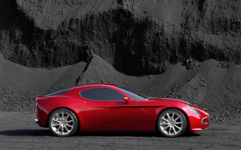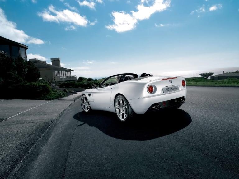 Au reste, une contemplation attentive du prototype ne laissait guère planer de doutes quant aux sources d’inspiration de ses auteurs (le Centro Stile Alfa Romeo, sous la férule de Wolfgang Egger) : la firme milanaise avait délibérément choisi de se vautrer, toute honte bue, dans un retro-design échevelé, très en vogue à ce moment-là dans le domaine des concept-cars comme dans celui des automobiles de série ; nos lecteurs se le rappellent sans doute, la New Beetle de J Mays puis la Mini de Frank Stephenson avaient ouvert une brèche dans laquelle bien des manufacturiers s’étaient engouffrés avec des fortunes diverses. Pour sa part, la 8C des années 2000 (une dénomination évacuant toute ambiguïté quant à l’architecture mécanique de l’engin et rendant simultanément hommage à ses aïeules d’avant- et d’après-guerre) ne constituait pas, loin s’en faut, le plus mauvais exemple d’une école stylistique qui aura fait long feu, jusqu’à nos jours. Tout en carbone et en galbes suggestifs se concluant sur un postérieur à pan coupé du plus bel effet, ayant banni tout accessoire vulgaire, la physionomie générale de l’auto s’apparentait à une très habile traduction des codes jadis en vigueur à Milan. En particulier, la proue convoquait joliment les mânes de la 33 Stradale autre Alfa Romeo de route à moteur V8 et fabriquée au compte-gouttes — tout en en modernisant le thème (substantiellement : une calandre étroite flanquée de deux « moustaches » et surplombée de projecteurs circulaires sous globe).