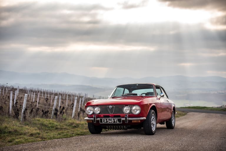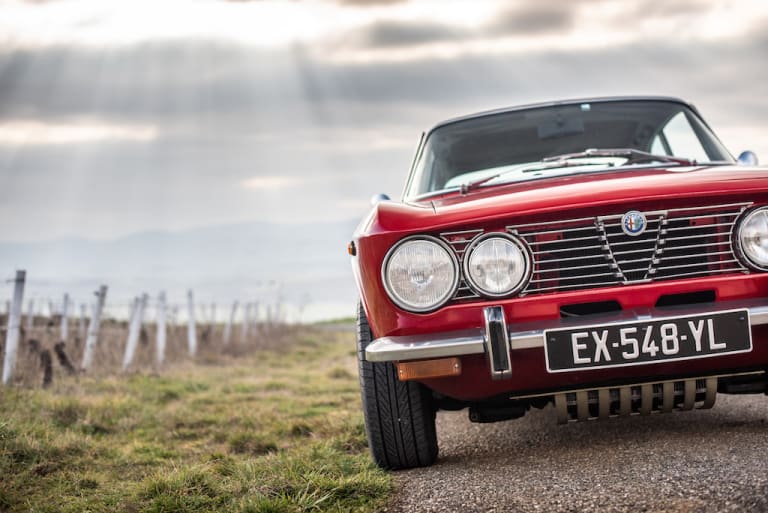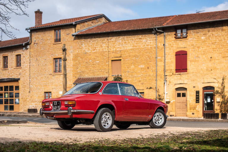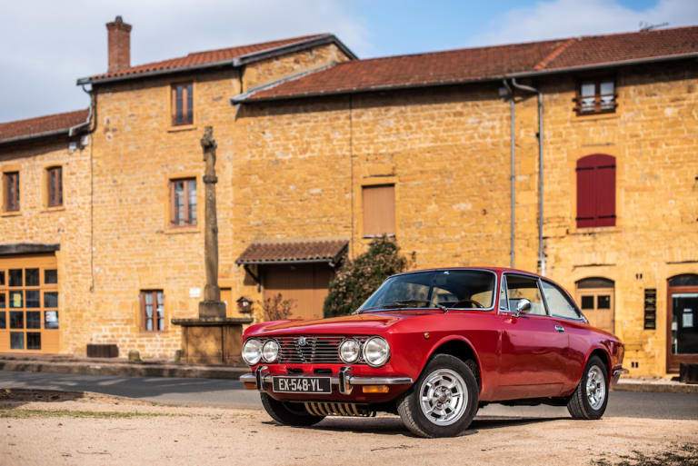 Son coupé Bertone rouge a commencé sa vie aux États-unis en 1975. Ramenée en France il y a une dizaine d’année, il a été l’objet d’une restauration complète de sa carrosserie tout en gardant des éléments d’origine de son intérieur. Le modèle Giulia GT 2000 Véloce est arrivé sur le marché à côté du 1750 en 1971. Son moteur de 1.962 cc, avec 150 ch SAE (132 ch DIN) permettait une vitesse de pointe de presque 200 km/h, de quoi faire rêver la jeunesse de l’époque. Le pont auto-bloquant est alors devenu de série contre sa disponibilité en option uniquement sur la 1750.