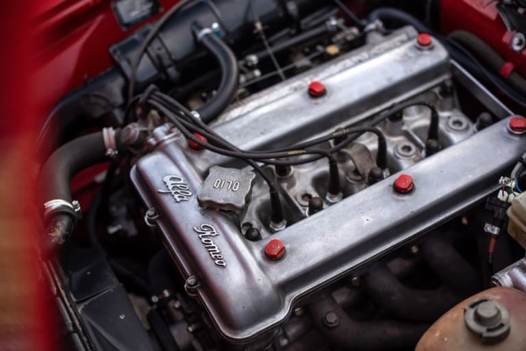 Le moteur de la GT 2000 a la réputation d’être le plus robuste, à condition de respecter son entretien régulier. Il est le seule à recevoir le vilebrequin nitruré et donc endurci par une procédure thermique à l’azote lors de sa fabrication. L’Alfa Romeo Giulia GT coupé Bertone a été introduite en 1963 comme modèle 1600 avec un moteur double arbre à cames en tête de 1570 cc. C’était le moteur de la berline Giulia introduite une année plus tôt. Construite jusqu’en 1976, 210.495 exemplaires sont sortis de l’usine Arese près de Milan, tous modèles confondus de la Giulia GT, dont proche de 40.000 unités de la GT 2000 Véloce.