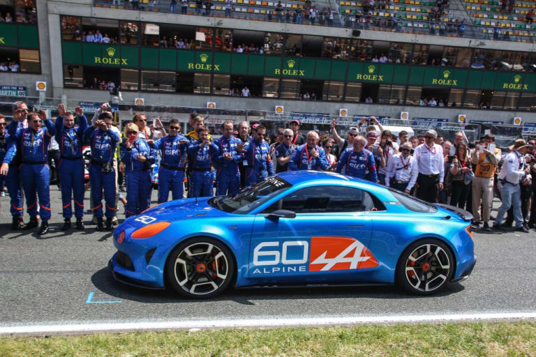 Commémoration des 60 ans d’Alpine, en 2015, avec la présentation de l’Alpine Célébration et toute l’équipe Signatech-Alpine.