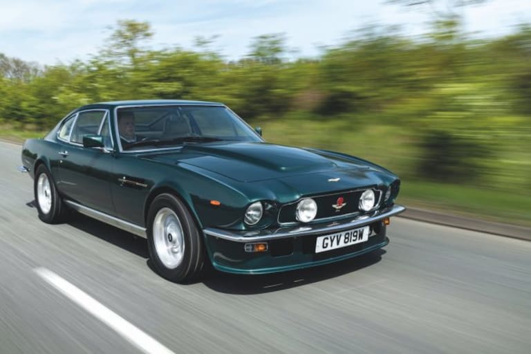 Nous sommes en février 1972. Sir David Brown, propriétaire d’Aston depuis vingt-quatre ans, jette l’éponge sous la pression de son conseil d’administration : les exercices déficitaires successifs ont abouti à un endettement susceptible de compromettre l’avenir de l’entreprise, voire même de la David Brown Corporation tout entière. Moyennant quoi les initiales de l’ancien taulier, qui nommaient les modèles de la firme depuis la fin des années 40, doivent disparaître ; c’est ainsi que la DBS lancée en 1967 change d’identité et aussi de visage. Aux quatre optiques et à la calandre chromée bien connues de tous les amateurs de la série The Persuaders! succède une physionomie dont la parenté avec la Ford Mustang contemporaine peut surprendre mais qui, en définitive, s’intègre harmonieusement à un design globalement inchangé. Dues à William Towns, les lignes tendues de l’auto s’avèrent résolument ancrées dans la décennie qui vient de commencer et marquent une franche rupture avec le style des DB4, 5 et 6, défini par la Carrozzeria Touring une quinzaine d’années auparavant. Désormais baptisée simplement « V8 », la voiture n’évolue pas de prime abord sur le plan mécanique et reprend le 5,3 litres dessiné par Tadek Marek pour la DBS, associé soit à une boîte mécanique ZF, soit à une transmission automatique Chrysler Torqueflite ; c’est à ce groupe moderne, tout en alliage, à quatre arbres à cames en tête, que toutes les Aston Martin vont exclusivement faire appel jusqu’à l’apparition de la DB7 en 1993. Néanmoins, l’ancien six-cylindres va rester disponible en parallèle et équiper 71 exemplaires d’une version méconnue, dénommée « Vantage » et donnée pour 325 chevaux mais dont la production s’achève dès 1973. Les premières AM V8 présentent aujourd’hui le charme de leur époque : en ce début des seventies, elles sont encore épargnées par l’embourgeoisement qui, plus tard, va caractériser leur évolution et que d’aucuns regretteront avec une certaine véhémence. Sobre et tout de noir vêtu, le mobilier de bord témoigne d’un luxe presque janséniste en comparaison de la débauche de boiseries qui s’imposera progressivement à partir de 1978. Grand tourer par excellence, l’Aston marche sans vergogne dans les pas de ses aînées et il faut aller chercher une Ferrari 365 GT/4 2+2 ou une Maserati Ghibli pour trouver des rivales à sa mesure, avec cet agrégat subtil entre raffinement de l’accueil et sauvagerie mécanique, élégance transcendée et performances de haute lignée.