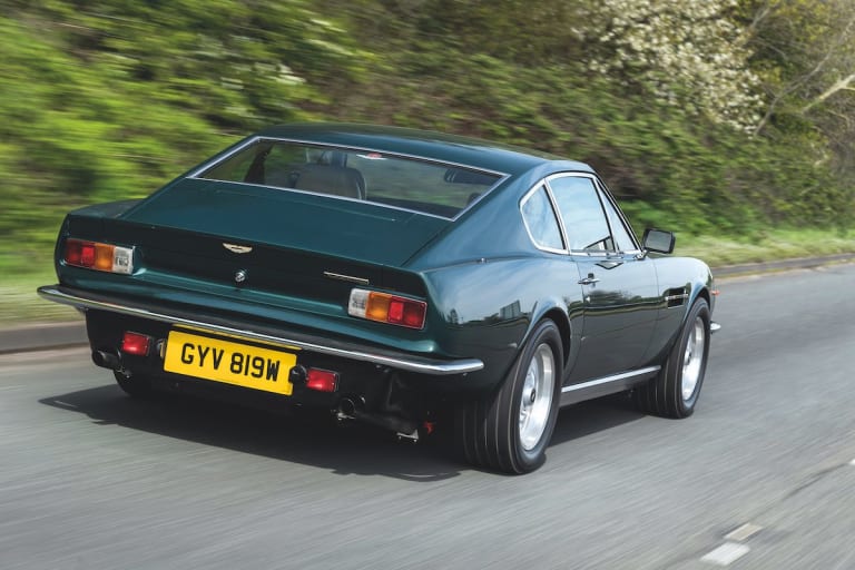 En 1973, alors que la situation financière d’Aston ne parvient pas à se stabiliser, l’Aston Martin V8 connaît ses premières évolutions marquantes. De la sorte, l’injection Bosch héritée de la DBS cède la place à quatre carburateurs Weber double corps, qui imposent une prise d’air de plus grandes dimensions sur le capot. C’est sous cette forme que l’auto sera la plus produite, avec 967 exemplaires jusqu’à l’automne de 1978. Toutefois, il s’agit alors d’une période particulièrement sombre pour Aston Martin, qui se déclare en faillite fin 1974. La production s’interrompt et il faut attendre le début de 1976 pour qu’elle redémarre, la firme ayant trouvé de nouveaux propriétaires qui vont investir de façon significative pour moderniser et étendre la gamme. C’est à eux que l’on doit notamment la réapparition d’un modèle « Vantage » en 1977 ; cette fois, l’auto ne se contente plus de concurrencer les coupés de grand tourisme mais vise carrément les supercars du calibre de la Ferrari BB 512 ou de la Lamborghini Countach — et, du moins en termes de performances, elle s’en donne les moyens : le V8 délivre désormais 395 chevaux et 550 Nm de couple, ce qui transforme le coupé anglais en une brute aussi authentique qu’attachante. Bien sûr, la puissance ne fait pas tout et l’architecture déjà vieillissante de l’Aston ne lui permet évidemment pas de se montrer aussi efficace que ses rivales italiennes dans certaines circonstances. Son moteur avant comme son châssis, qui doit encore beaucoup à la DB6, datent irrémédiablement le modèle et l’inscrivent dans un typage très éloigné des berlinettes surbaissées à moteur central, formes agressives et pop up lights, dont le prestige mécanique demeure de surcroît hors de portée de l’Anglaise si l’on se borne à recenser les cylindres de chaque protagoniste. Mais peu chaut aux clients de Newport Pagnell, eux qui ont su comprendre l’exotisme de la V8 et de ses dérivés. Les Aston de cette époque parlent un langage qui leur est spécifique ; ce ne sont ni des Jaguar, ni des Bentley, ni des Bristol, ni même le résultat d’une improbable alchimie entre les trois. Il en émane un parfum d’artisanat — et pour cause… —, de rareté — la production annuelle se compte alors en dizaines d’unités —, sans parler d’une forme de snobisme éclairé qui relègue les plus onéreuses des Porsche ou des Mercedes-Benz au douloureux purgatoire de la banalité.