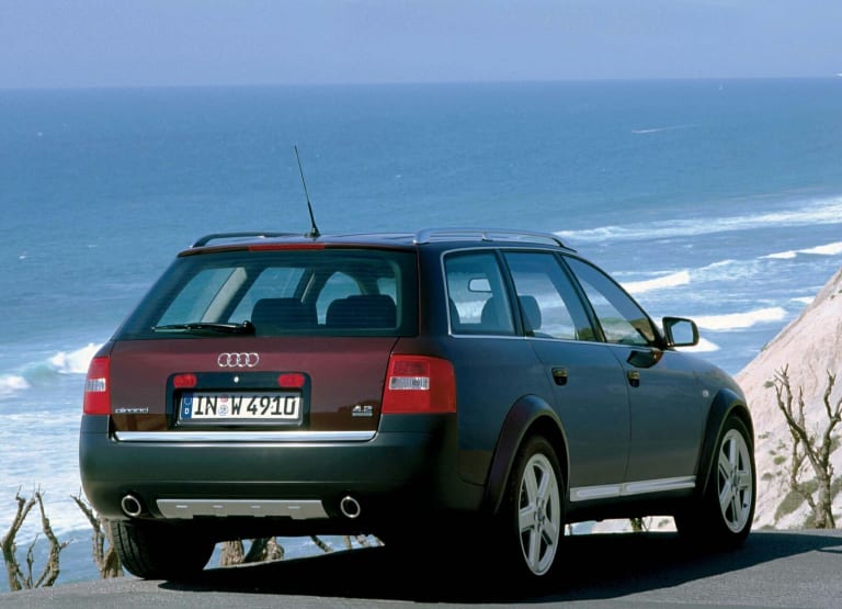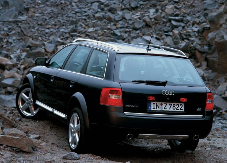 Si la génération « C4 » apparue en 1990 avait déjà bénéficié du V8 maison, celui-ci n’avait toutefois occupé qu’une place marginale dans la gamme, ne retenant que l’attention de rares connaisseurs. Pour sa part, la nouvelle A6 y aura largement recours, et pas seulement pour les exécutions sportives S6 et RS6 ; le break Avant y a également droit, à la fois dans ses versions courantes – qui vont s’attaquer aux BMW 540i Touring et Mercedes E 430 T-Modell – puis, à partir de l’automne 2002, sous les traits de l’allroad quattro (les deux termes étant toujours rédigés sans majuscule par Audi) qui nous intéresse aujourd’hui. On ne le sait pas encore à ce moment-là mais ce modèle inattendu, présenté en 1999 et qui procède de la même démarche que la Volvo V70 Cross Country apparue en 1997, constitue la première étape d’une démarche qui, six ans plus tard, va aboutir au Q7, premier SUV de l’histoire de la firme. Crossover avant l’heure, l’allroad (qui, dans sa désignation officielle, ne s’appelle plus A6) apparaît comme une sorte de chaînon manquant entre l’univers des breaks et celui des SUV. Comme ses sœurs de gamme dotées de la même transmission intégrale, elle se montre capable d’exploiter les vertus d’icelle sur le goudron, mais aussi – c’est là tout l’intérêt de la formule – quand celui-ci se dégrade fortement, voire disparaît pour laisser place à des voies plus ou moins carrossables, voire à des chemins de terre. Bien sûr, il ne s’agit en aucun cas de pouvoir suivre un Land Cruiser dans ses œuvres, la garde au sol de l’auto ne lui permettant pas de pousser la plaisanterie trop loin ; pourtant, lorsque l’on examine la fiche technique de cette première allroad, on décèle des velléités d’élargissement de la gamme qui ne tarderont pas à s’épanouir – pour le meilleur ou pour le pire, selon les points de vue…