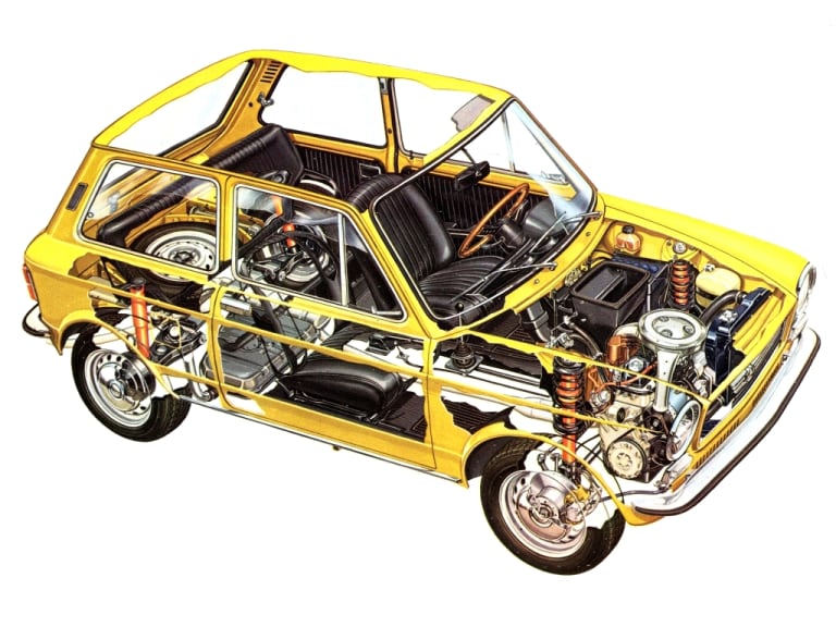 À l’instar de l’expérience effectuée avec la Primula en 1964, c’est Autobianchi, filiale du groupe turinois, qui se retrouve à partir sur le champ de bataille afin d’essuyer les plâtres en cas d’échec. C’est également l’occasion pour Fiat de pouvoir tester sa propre interprétation de la petite citadine à moteur transversal afin de pouvoir reprendre ces procédés sur la future Fiat 127 une fois ceux-ci bien éprouvés. Dante Giacosa est appelé à l’œuvre et propose une idée plus moderne et plus polyvalente de la Mini. Conservant des dimensions contenues, la future Autobianchi sera plus habitable en adoptant dix-huit centimètres supplémentaires en longueur, et, surtout, en se munissant d’un hayon arrière. Concernant la mécanique, on récupère le 903 cc des Fiat 850 Sport, on ramène sa puissance à 44 chevaux qui assurent 135 km/h en vitesse de pointe et le tour est joué.