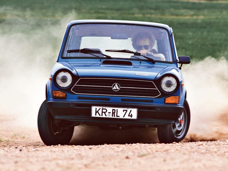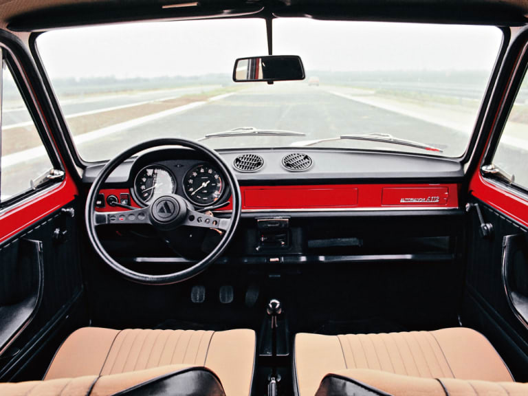 L’A112 Abarth revendique 982 cc de cylindrée pour délivrer 58 chevaux DIN grâce à une augmentation de la course et d’un nouveau vilebrequin en acier nitruré. Cette mécanique revue et corrigée emmène donc les 700 petits kilos de l’engin à plus de 150 km/h dans des accélérations plutôt impressionnantes. Toujours pour se montrer plus aguichante, elle dispose d’une présentation spécifique en arborant une calandre bien à elle faisant la part belle au patronyme de son prestigieux préparateur, de jantes spécifiques et, comme toute sportive seventies digne de ce nom, d’éléments de carrosserie de couleur noir mat censés protéger le pilote de tout éblouissement.
