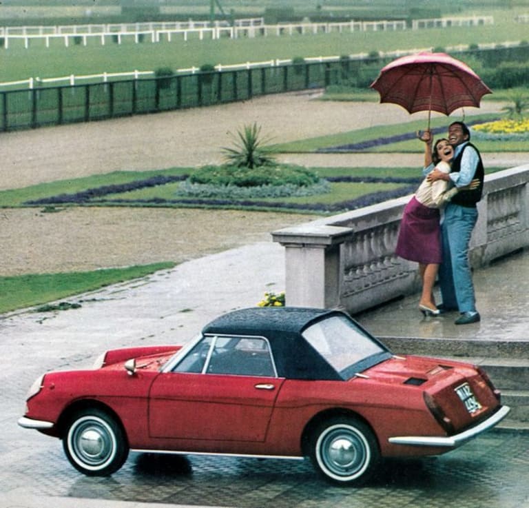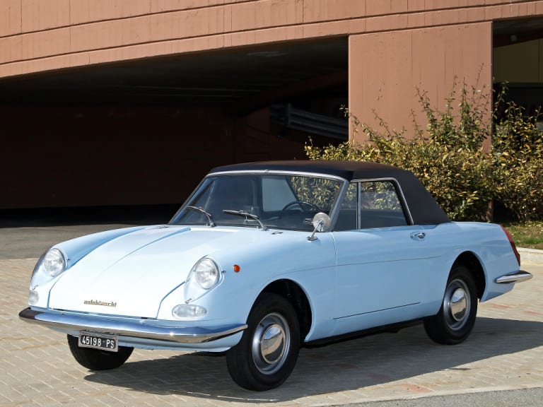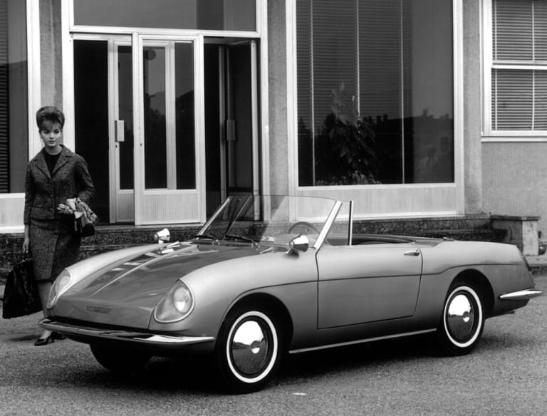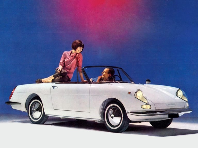 C’est en 1963 qu’est présenté ce petit cabriolet dessiné par Luigi Rapi au salon automobile de Turin. Cette ravissante voiture propose un châssis et une mécanique de Fiat 600D (propulsion donc, avec moteur à l’arrière), mais agrémentée d’une élégante carrosserie en fibre de verre, une première en Italie. A son lancement en 1964, elle dispose du 750 cm3 à la puissance faramineuse de 29 ch. Cette première série sera suivie rapidement d’une deuxième série équipée du 800 cm3 développant 31,5 ch. N’attendez donc pas de la Stellina des performances de sportives.
