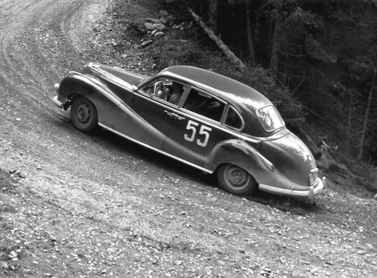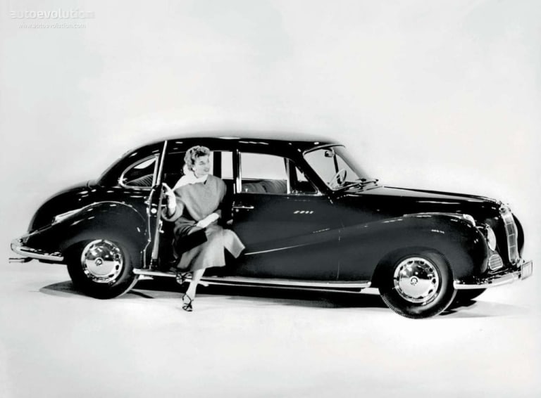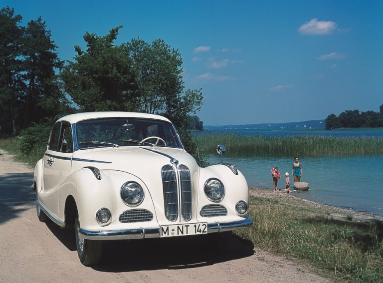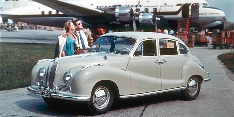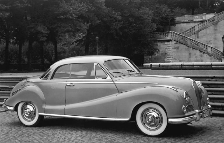 Il faut faire un effort d’imagination pour situer une telle automobile aujourd’hui. Dans son flot de la première moitié des années 50, elle côtoyait par ses mensurations une Salmson Randonnée, un peu plus serrée ou une Hotchkiss Anjou, un peu plus longue. Mais ces références sont aussi abstraites. La 502, passant pour la « grande » BMW des années cinquante, un brin cérémonieuse, équivaut en fait avec ses 4,73 m à une BMW série 3 G20 actuelle (L. 4.71 m). Mais la 502 était étroite (l. 1.78 m contre 1.83 m à la G20) et nettement plus haute (1.53 m contre 1.44 m), toisant aussi la Gran Turismo, les deux regardées de haut par le SUV de la famille, un X3 (1.67 m). Et justement, question tarif, cette BMW ancienne en bel état, pour amateur d’autos d’un autre temps et peu courantes, peut atteindre 40 000 € pour une 501 munie d’un six cylindres, jusqu’à 60 000 pour une 2,6 litres, voire au-delà pour une 3,2 litres. L’empan tarifaire la situe entre une 318i 156 ch et une 330i 292 ch xDrive, voire une 340i plus onéreuse, mais qui n’a vraiment plus rien à voir avec son homonyme d’Eisenach. L’usage n’est pas le même entre une voiture de service et une auto de plaisance et il n’est guère que les superlatives qui ne fassent pas perdre de valeur.