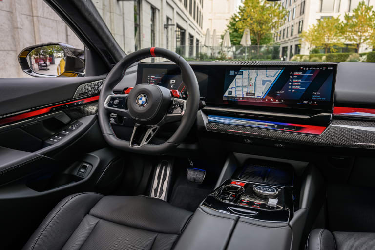 À quoi les motoristes bavarois répondront sans sourciller que l’engin, en dépit de ses performances et d’une puissance totale dépassant celle d’une Porsche 992 Turbo S, parvient à contenir ses rejets de CO2 grâce à la présence de sa machinerie électrique et des batteries qui vont avec – lesquelles, sous le diktat de normes européennes de plus en plus drastiques, sont devenues à peu près incontournables pour tout constructeur désireux de continuer à proposer des berlines de cette trempe. Et, dans l’absolu, les résultats sont là : 305 km/h en pointe, le kilomètre départ arrêté en 20,4 secondes, le 0 à 100 km/h en 3,5 secondes. Par surcroît, le conducteur de l’engin peut compter sur une transmission intégrale débrayable, une suspension adaptative et quatre roues directrices. S’il est pointilleux néanmoins, il pourra faire remarquer que les performances ne marquent pas de progrès par rapport à la F90, et qu’il arrive toujours un moment où l’ingénierie, aussi sophistiquée soit-elle, se trouve vaincue par les lois de la physique : une fois les aides à la conduite désactivées, lancer une machine de cinq mètres de long pouvant flirter avec les 2,5 tonnes si le pilote n’est pas seul à bord dans des acrobaties plus ou moins scabreuses sur un itinéraire sinueux peut éventuellement mal finir, même si l’auto s’avère bien plus sereine sur sol glissant que bon nombre de ses devancières…