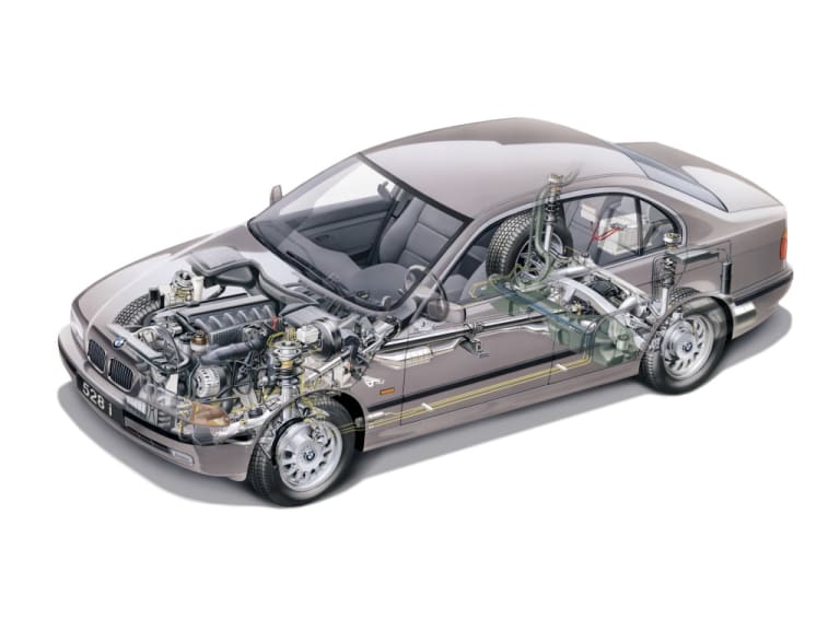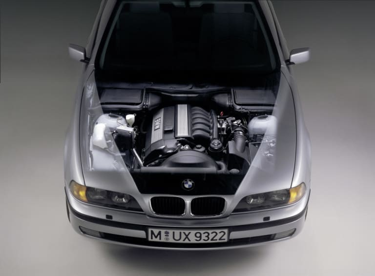 Pour compenser l’augmentation de taille et le poids croissant des équipements, les équipes de BMW vont imaginer des trains roulants entièrement en aluminium. De même, une grande partie du châssis sera réalisée dans ce matériau, contribuant à limiter l’embonpoint. En outre, cette génération de Série 5 se passera de la transmission intégrale jugée superflue et trop lourde. L’intérieur reste très classique, et ne fait là encore qu’évoluer l’agencement du modèle précédent. Comme pour l’extérieur, tout est fait pour satisfaire une clientèle exigeante mais pas vraiment exubérante. On trouve cependant de nombreux raffinements : outre la climatisation, l’E39 offre de nombreux airbags (notamment latéraux, inaugurés sur la Série 7 E38), un ordinateur de bord avec système de navigation GPS (courant aujourd’hui, c’était à l’époque un luxe) et même un téléphone pour les versions supérieures. Enfin, l’insonorisation est particulièrement travaillée pour atteindre un niveau inégalé. Sans parler des finitions, remarquables.