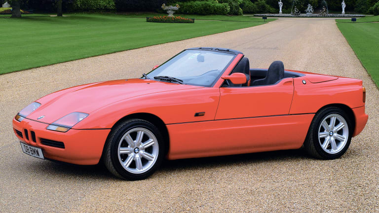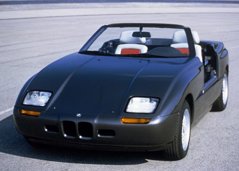 À l’automne de 1987, BMW aborde en pleine forme le Salon de Francfort. C’est la marque à la mode ; le catalogue ne cesse de s’étendre et, depuis deux ans, comporte notamment le cabriolet Série 3 E30 mentionné plus haut – sans conteste l’une des plus jolies décapotables de son temps, adulée notamment par les yuppies de New York ou de Los Angeles, sur lesquels le krach du mois d’octobre ne va toutefois pas tarder à s’abattre. Pourtant, depuis 1985, la division BMW Technik GmbH, chargée par sa maison-mère d’explorer des voies nouvelles à l’écart des processus de développement traditionnels du constructeur, élabore, dans un secret très relatif – des photos de prototypes roulants sont publiées très tôt dans la presse spécialisée avec l’aval de BMW –, une autre décapotable, plus précisément un roadster aussi éloigné que possible du cabriolet Série 3, à la ligne très pure mais de facture extrêmement classique. Dessiné sous la férule de Harm Lagaay, l’engin, dévoilé officiellement dans sa version définitive dans le cadre d’un IAA dont il constitue l’une des attractions majeures, stupéfie le public par la radicalité de son design, trapu, compact et tout entier dédié au fameux Freude am Fahren si cher à la marque. Baptisée Z1, ce qui signifie Zukunft 1 – c’est-à-dire « avenir n°1 » –, la nouvelle BMW fait également sensation par la plus visible de ses innovations ; l’auto est en effet dotée, en première mondiale, de portières coulissantes verticalement !