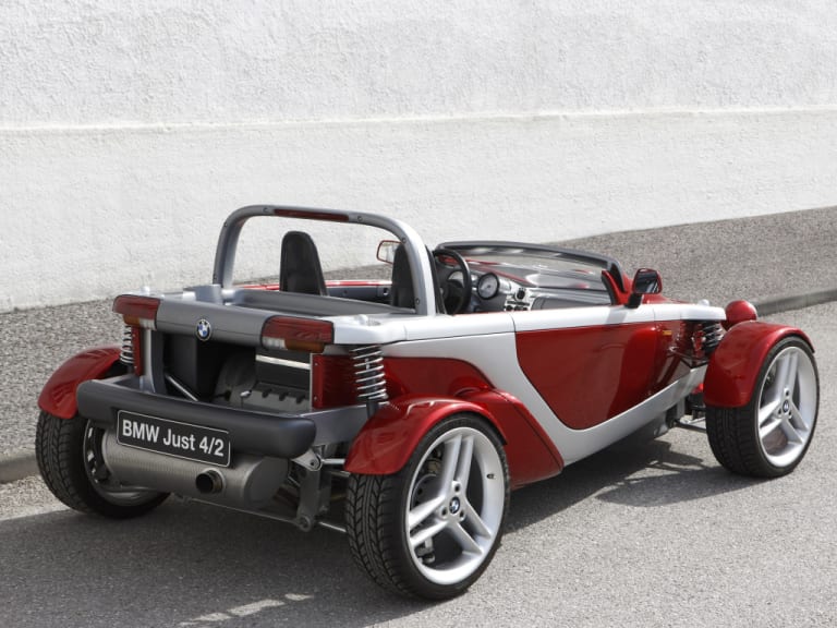 Après ce Z13, BMW allait s’attaquer à un tout autre domaine. Revenant au sport, mais incluant une tendance « tout-terrain », tout en conservant l’idée du moteur de moto, un 4 cylindres portée à 1100 cm3 et 100 chevaux tout de même : le Z21 Just 4/2 était né, en 1995. Si son contemporain Z18 présentait une sorte de petit roadster tout-terrain, le Z21 se débarrassait de toute carrosserie superflue, laissant deux petites places (just 4/2, justement) coincées entre des petits morceaux de métal, et des portes qui ne sont finalement que des barres d’aluminium.