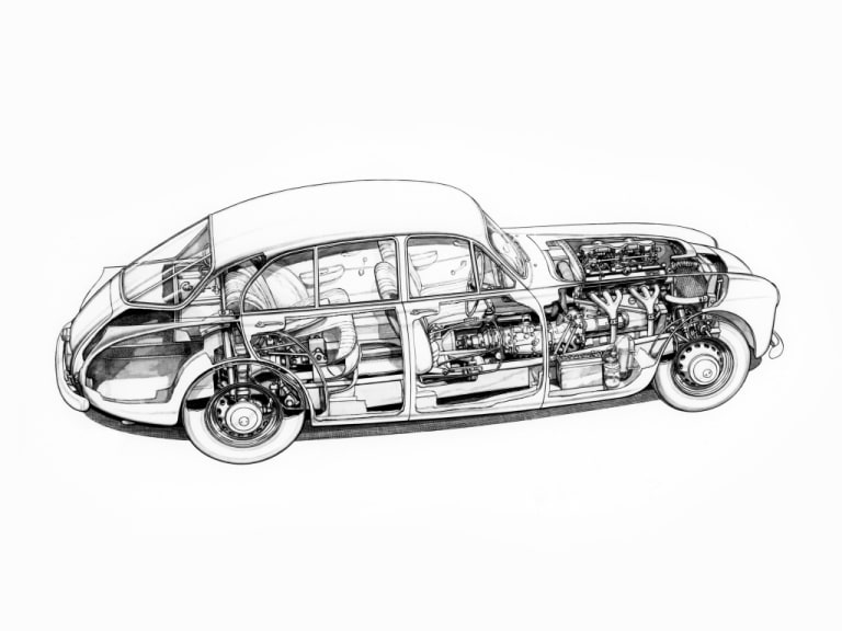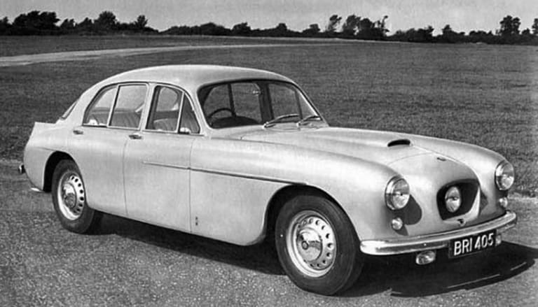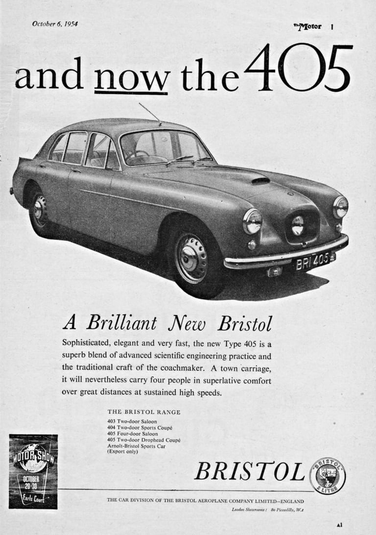 Tout commence en 1953, avec la 404 (on est toujours en Angleterre hein, pas de panique), un joli coupé qui inaugure chez Bristol un nouveau design qui s’éloigne enfin des calandres BMW (oui, rappelez-vous, Bristol fabriquait jusqu’à présent des dérivés de BMW après en avoir obtenu la licence). En 1954, les dirigeants de la petite firme anglaise décide de lui donner un dérivé « berline » qui prendra le nom de 405 Saloon.