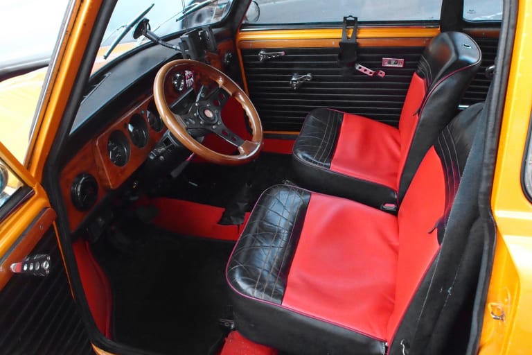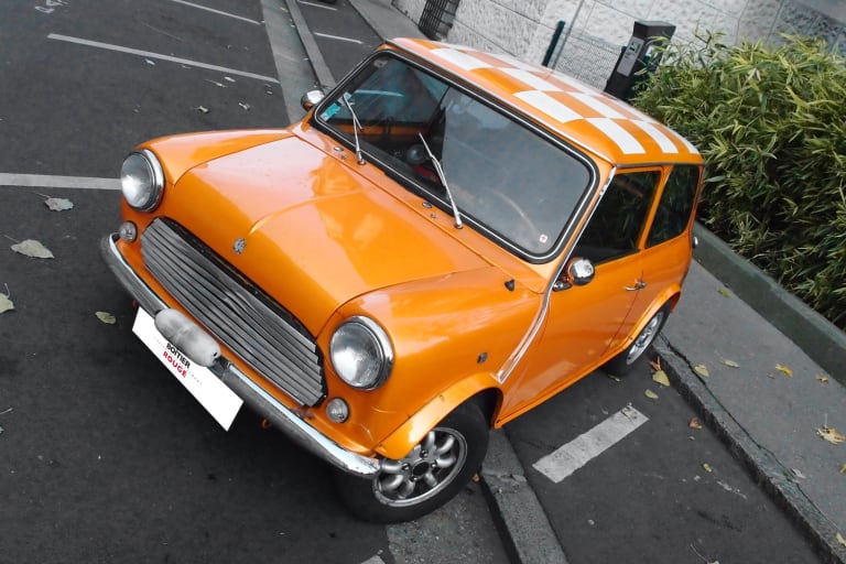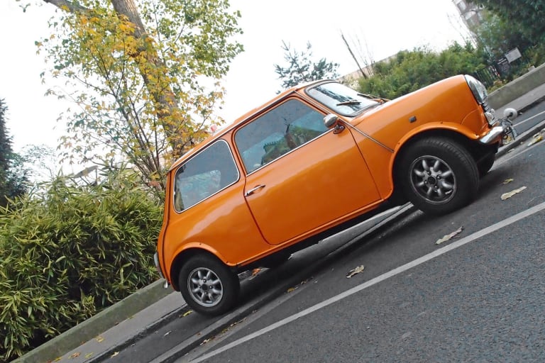 Je tente depuis trois ans de transformer ma chère Austin Mini en voiture. Bien obligé, je roule avec tous les jours et elle passe la nuit dans la rue. C’est comme ça, je n’ai pas de box, c’est trop cher. La lente réhabilitation de ma bestiole est mécanique et intérieure. Au garagiste ce qui se trame sous le capot, à moi les joies de transformer l’habitacle. La peinture orange offre par endroit de belles finitions peau d’orange, l’ancien propriétaire avait de l’humour. Ma Mini se fait régulièrement beugner par des cornichons qui ne savent pas se garer, il est inutile de changer les pare-chocs cabossés et la calandre vrillée. Lorsque je la gare dans des quartiers chics, genre VIIe, des crétins m’arrachent l’écusson ou tentent de retirer les caches-jointures d’ailes. L’entretien extérieur se limite donc à arrêter la rouille à défaut d’arrêter la bêtise. Ma Mini reste dans son jus. Sinon, aucune incivilité n’est à signaler en banlieue. J’ai tout de même retiré la lèvre supérieure du capot pour lui donner un air sixties. J’achèterai la grille MK1, un jour.