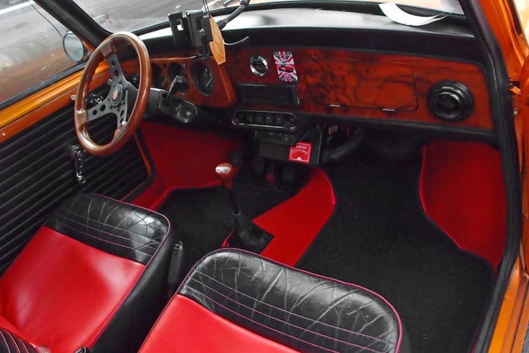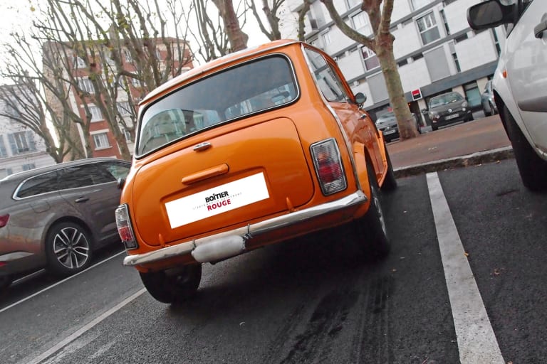 Mais quel plaisir à son volant, cette sensation de grand huit dans les virages serrés, cet espace vitré ouvert sur le monde, le volant qui vous donne toutes les infos sur ce qui se trame sous les roues. Ah, si elle avait 20 chevaux de plus… Ça lui en ferait 50, mais ce serait quelque chose ! Ma Mini est attachante, elle gronde comme un gros chien. Elle respire l’avant, le temps des choses pas trop compliquées. Ça s’appelle ça la jeunesse, je ne ma raconte pas d’histoire. On démarre, un peu de starter et voilà. Elle se faufile partout. Je me vois partir en Écosse avec, si je trouve un fou ami qui accepte de remonter dedans une seconde fois. Aller travailler en Mini est un plus. Le fait même d’en posséder une vous rend intéressant aux yeux de vos clients ; vous êtes un original. On discute devant la voiture et ça les sort du quotidien. Idem lorsque je bricole dessus en bas de chez moi. Entre le policier sympa (pas le droit de trop bricoler dans la rue), les curieux et les passionnés, on a vite fait de faire café rencontre. Les passants baissent la garde, le gars de l’agence immobilière se souvient de sa 1100, la dame regrette d’avoir vendu sa Balmoral, le gars du kebab vient d’en trouver une « comme neuve » et les enfants veulent monter dans « lavoitureorange ».