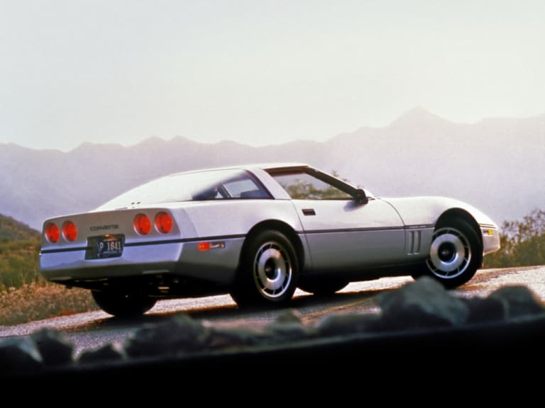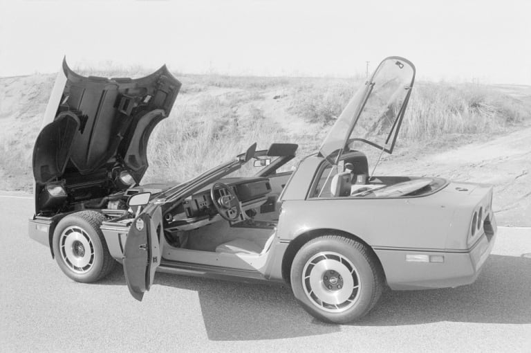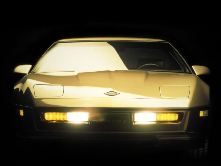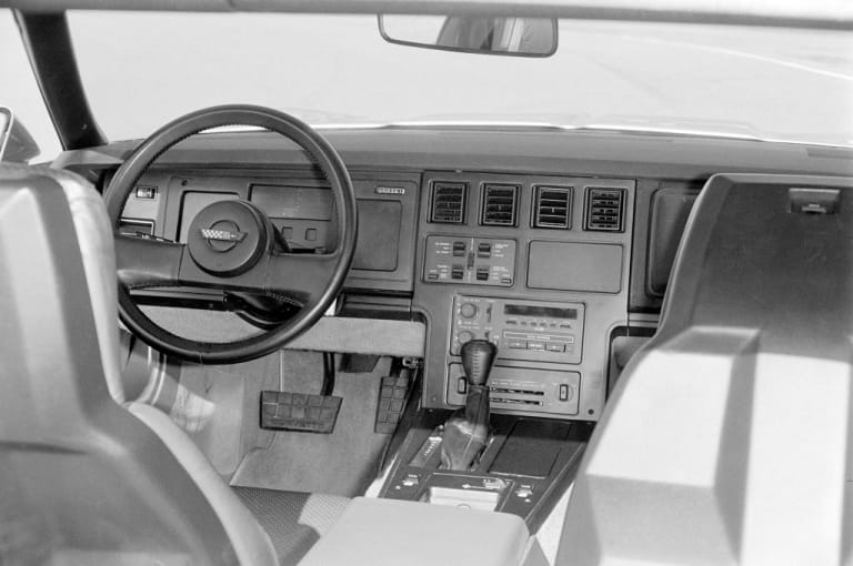 Conçues sous l’autorité de Bill Mitchell, qui pilota le style GM de 1959 à 1980, deux générations successives de Corvette, la C2 « Sting Ray » de 1963 puis la C3 de 1968 — très inspirée du concept Mako Shark II dévoilé trois ans auparavant — ont avant tout marqué leur temps par la puissance de leur vocabulaire esthétique. Bien sûr, les V8 (small blocks et big blocks) étaient toujours fidèles au poste, avec des cylindrées qui culminèrent à 454 ci, soient tout de même 7,4 litres ; mais leur rusticité, très éloignée de la sophistication en vigueur chez les concurrents européens, puis l’arrivée de normes de dépollution mutilatrices amenèrent progressivement le modèle à la lisière du ridicule. Ainsi, les dernières C3, tombées de chaîne en 1982, ne tiraient plus que 200 chevaux du vénérable moteur L83, dont les 5737 cm3 et l’arbre à cames central correspondaient à un caractère sui generis et, pour tout dire, peu goûté en dehors du Nouveau Monde. Vis-à-vis des références européennes, qu’elles concernent le luxe ou le sport, on a souvent observé, chez General Motors, une forme de défiance mêlée à un certain complexe d’infériorité et l’indispensable renouvellement de la Corvette, au début des années 1980, apparut comme une opportunité incontournable de se hisser au niveau des meilleurs. Désormais, il s’agissait moins de cultiver le folklore local que de s’engager avec une ferme résolution sur la voie du progrès technique, en n’hésitant pas à recourir à des solutions novatrices, tandis que le style, délibérément moins flamboyant, allait se rapprocher, lui aussi, des vertus usuellement constatées de ce côté-ci de l’océan.