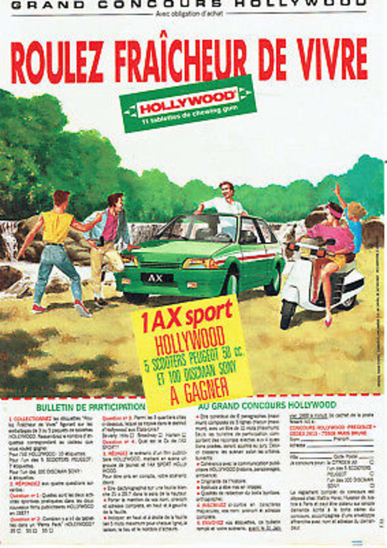 Aujourd’hui, on entend les jeunes dire « c’est frais » quand nous disions « c’est cool » dans les années 80. Pourtant, le symbole de la « coolitude » en 1987, c’était bien la fraîcheur de vivre représentée par Hollywood Chewing Gum et ses pubs remplies de BMX traçant dans la flotte (fraîche donc) éclaboussant la caméra. À la même époque, la voiture cool (et donc fraîche) pour les jeunes, c’était la Citroën AX. Et summum de la gamme, pour les plus fortunés : l’AX Sport en série limitée à 5000 ex. Aussi, pour promouvoir sa marque et asseoir son image auprès de la jeunesse, Hollywood décide de proposer, en premier lot d’un jeu concours, une AX Sport entièrement décorée aux couleurs de son chewing gum fétiche à la clorophyle.