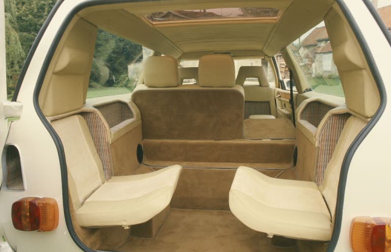 Pour cela, Sbarro va proposer, en plus des 2 places avant, et des 3 places de la banquette arrière rabattable 2/3 1/3, deux fauteuils « strapontins » à la conception originale : ils disposent de deux positions, soit collés aux flancs de la carrosserie (ils disposent alors d’un appui-tête fixe intégré au pilier C), soit dans le sens de la marche grâce à un système de pivot. Repliés, ils laissent toute la place pour plus de chargement. Malin.