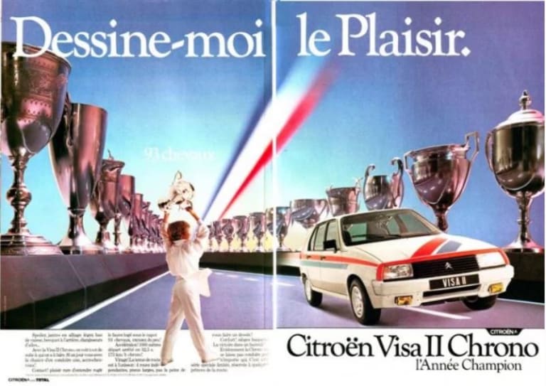 Lorsque l’on consulte les premières brochures publicitaires consacrées à la Visa en 1978, on peine à imaginer que cette même auto va, quelques années plus tard, se transformer en sportive. Initialement, les variantes à moteur bicylindre assurent l’entrée de gamme et sont chargées de récupérer la clientèle essentiellement rurale de feue l’Ami 8, tandis que les quatre-cylindres Peugeot sont censés permettre à la Citroën de rivaliser avec les citadines polyvalentes qui pullulent alors déjà sur le marché européen. De sport, il n’est alors guère question ; la version la plus entreprenante, baptisée Super X, ne dépasse pas 64 chevaux — c’est-à-dire, histoire de fixer le débat, une trentaine de moins qu’une Renault 5 Alpine… Pourtant, les dirigeants de Citroën comptent bien dynamiser (et rajeunir) l’image d’une Visa dont le succès est crucial pour faire vivre le réseau en attendant l’arrivée de la BX. Chez VW par exemple, ils ont pu observer combien la GTI avait été bénéfique pour l’ensemble de la gamme Golf ; même s’il n’a pas les moyens d’acquérir une version de pointe, l’acquéreur d’un modèle de base se sent valorisé par celle-ci. À ce niveau de gamme, le sport (ou parfois sa simple évocation) s’avère incontournable et cela tombe bien : les étagères de PSA regorgent justement de composants propices à l’élaboration de dérivés susceptibles d’attirer une clientèle autant soucieuse d’afficher son dynamisme que de revendiquer ses compétences au volant !