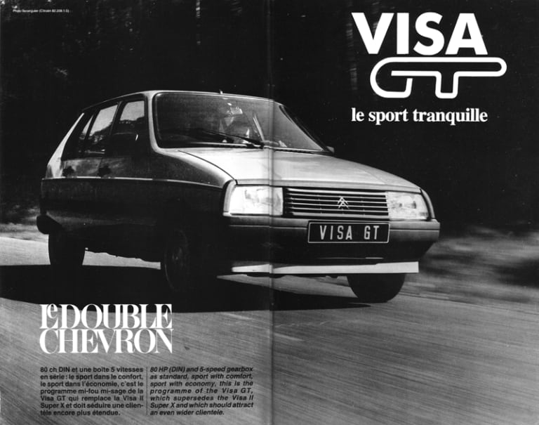 Grâce à Jean-Paul Parayre, qui préside aux destinées de PSA de 1977 à 1984, le groupe français a pu mettre sur pied une véritable banque d’organes dans laquelle ses différentes marques peuvent puiser selon leurs besoins. Cette initiative de rationalisation industrielle, devenu la norme aujourd’hui, constitue une véritable innovation en ce temps-là ; c’est elle qui va permettre l’essor de la gamme Visa, tirée vers le haut par des variantes sportives au typage très éloigné des premiers modèles. Dans ce contexte, la GT prend en quelque sorte la suite de la tonitruante Chrono, diffusée en série limitée au printemps 1982 et dont les 2160 exemplaires se sont écoulés sans difficulté – prouvant par-là même qu’il existe bel et bien une clientèle potentielle pour une Visa sportive… Cette fois cependant, il n’est plus question d’un tirage numéroté mais d’une version de série en bonne et due forme qui, par surcroît, ne s’adresse pas tout à fait à la même clientèle que la Chrono, dont la mécanique – empruntée pour l’essentiel à la 104 ZS2 – et la présentation évoquaient sans vergogne les versions « Trophée » du modèle développées par Citroën Compétitions. La GT (dont le logo reprend le style de la CX GTi) cherche au contraire à intégrer le petit monde des citadines « sportivo-bourgeoises », capables de rouler vite mais sans bousiller les vertèbres ni les tympans de leurs utilisateurs !