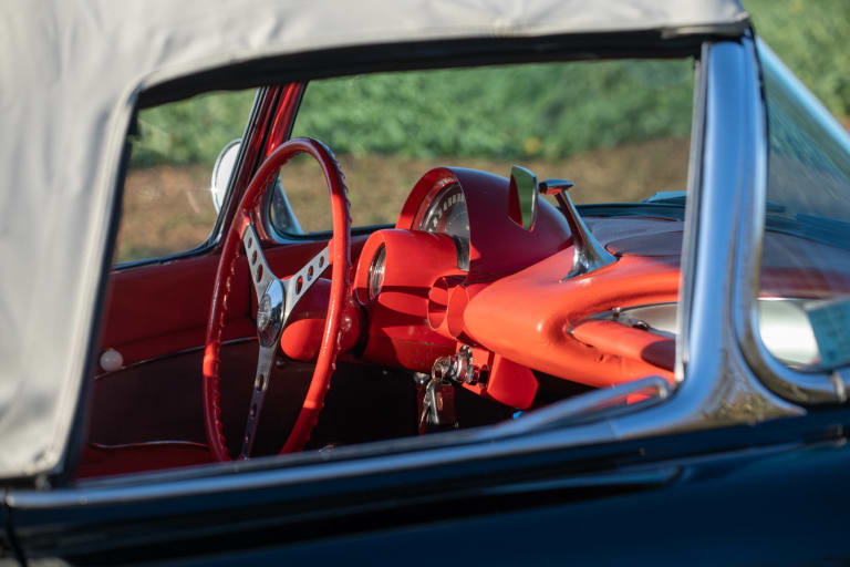 « Je me suis mis en quête d’une C1 cette année. Je voulais un modèle sorti entre 1956 et 1961. À partir de 1958, avec les doubles optiques, c’est ce que je désirais le plus. Et puis le modèle 1958 possède cette calandre à neuf dents que j’aime beaucoup. Quand j’ai vu cette voiture, j’ai flashé. J’ai la facture d’origine de ma C1, ce qui m’amuse beaucoup. Elle a la boîte mécanique à quatre rapports, qui était une option à l’époque — la boîte standard n’en avait que trois. Elle a ses couleurs d’origine, que j’adore. Sa peinture noire est très classe. J’ai fait faire un lustrage complet. Elle a aussi l’option « Positraction », qui correspond au pont autobloquant. C’est top ».