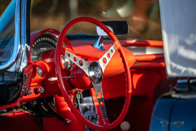 La Chevrolet Corvette C1 est donc le modèle inaugural de la « sports car » américaine, introduit en 1953. Elle a connu une évolution assez marquante avec la métamorphose intervenue pour l’année-modèle 1956. À ce moment-là, le modèle a en effet abandonné son moteur initial — un six-cylindres en ligne — au profit de son tout premier V8, tandis que d’importantes modifications étaient apportées à son design. L’auto de Didier est de 1958, l’année du début des quatre phares à l’avant, accompagnés par un surcroît de chromes. Son exemplaire est équipé du V8 4,6 litres, soit 283 ci, qui est donné pour 290 chevaux. Comme le proclamait Chevrolet, « plus d’un cheval par cubic inch », ce qui était beaucoup par rapport à la concurrence de l’époque à Detroit.