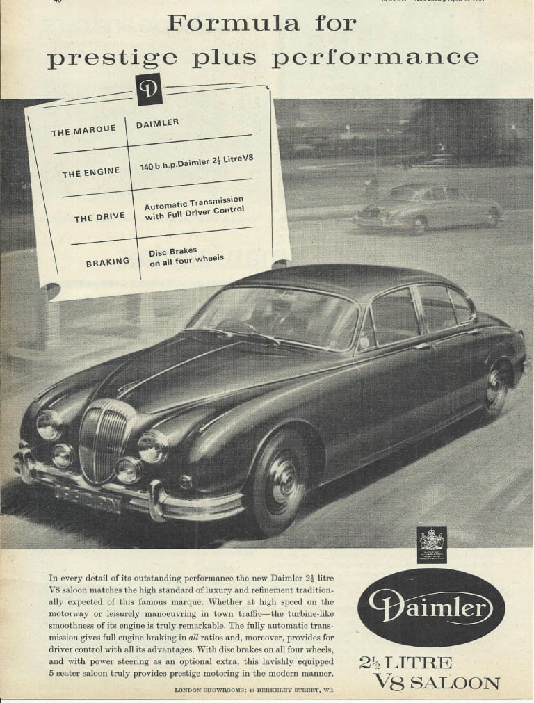 Lancée en 1962, la 2.5 V8 (puis V8 250 à partir de 1967) complètera parfaitement la Mk2 dans une sorte de gamme parallèle orientée “confort et luxe”, trouvant 17 620 acheteurs jusqu’en 1969 (à comparer aux 83 976 Mk2 et 7 234 exemplaires de 240 ou 340 entre 1959 et 1969). Elle initiait le concept de gémellité entre Jaguar et Daimler : en 1966, la Daimler Sovereign appliquait à nouveau la méthode sur la base d’une Jaguar 420. En 1968, la marque lançait son dernier modèle spécifique, la DS420 (un modèle produit jusqu’en 1992 tout de même), tandis que le reste de la gamme se calquait sur celle de Jaguar tout en favorisant luxe et confort, comme la première V8.