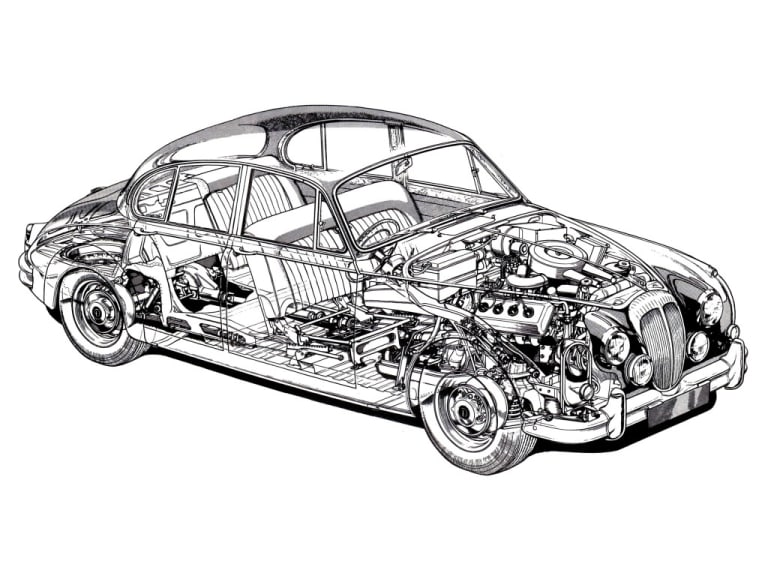A l’origine, la direction de Jaguar n’était pas très sûre de l’intérêt de l’opération et très peu de moyens furent accordés au développement de la voiture, au point d’utiliser d’abord une vieille Jaguar Mk1 qui traînait dans l’usine comme mulet. Une fois validés les premiers essais, on passa donc à une caisse de Mk2. Il fallut légèrement adapter le V8 pour l’installer dans le compartiment moteur mais le concept pouvait enfin être validé, faisant de la 2.5 V8 la première Daimler dotée d’une coque autoporteuse.