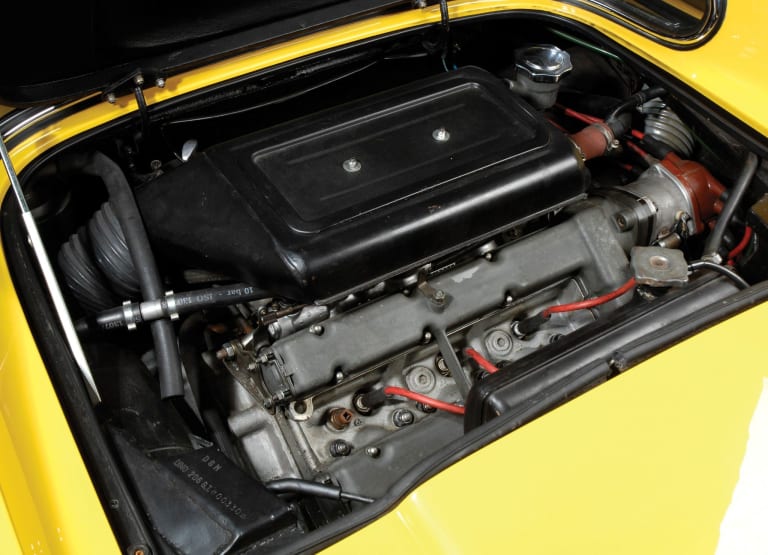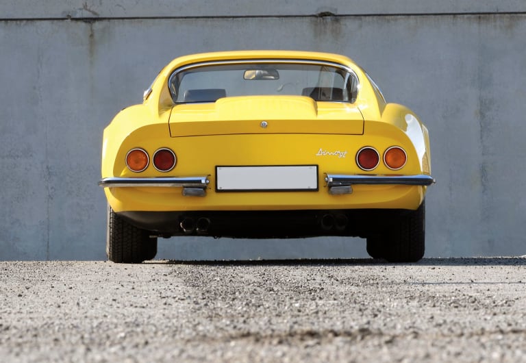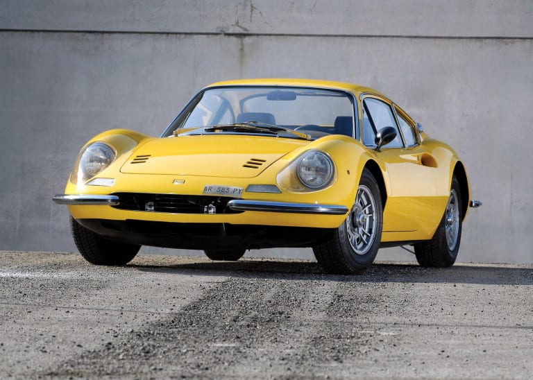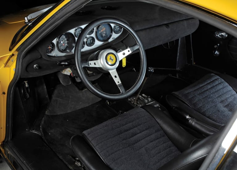 Les galbes généreux des ailes avant – leur perspective est toujours émouvante depuis l’habitacle -, la lunette concave, les panneaux de custode élégamment prolongés jusqu’au pan coupé de la poupe et le profil scarifié par une prise d’air s’épanouissant dans l’aile arrière pour venir mourir au sommet de la portière définissent un design saisissant, en particulier si on le compare aux « vraies » Ferrari de ce temps-là. Indéniablement, du point de vue du style comme de la technique, la Dino est un véhicule exploratoire, qui défriche l’avenir avec une hardiesse que s’interdisent encore ses grandes sœurs plus noblement dénommées. Les futures BB et 308 GTB doivent beaucoup à cette série, dont la 206 GT n’est, en définitive, qu’une sorte d’ébauche à la gestation difficile : les premiers acquéreurs ne seront livrés qu’au printemps 1969 – c’est-à-dire quelques mois seulement avant la présentation de la 246 GT à Turin, à l’automne de la même année, plus aboutie et nantie d’un moteur dont la cylindrée passe à 2418 cm3 pour 195 chevaux et dont l’empattement gagne six centimètres, engendrant une meilleure stabilité. Il fallait bien cela pour engager la lutte contre une Porsche 911 de plus en plus ambitieuse… De nos jours, ce sont la grande rareté du modèle et son intérêt historique qui ont hissé sa cote à des niveaux stratosphériques : en 2025, RM Sotheby’s a ainsi vendu une 206 GT pour près de 650 000 dollars !