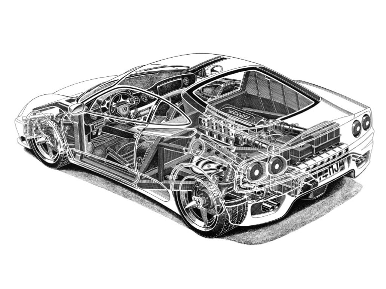 La vraie révolution vient d’ailleurs cependant, notamment de l’utilisation de technologies issues de la F1. Ainsi, dans la lignée du travail aérodynamique effectué sur la carrosserie, elle reçoit un fond plat et un extracteur arrière type F1. Un gros travail est effectué sur le poids afin de rendre la 360 Modena encore plus performante que sa devancière. Elle reçoit ainsi un châssis entièrement nouveau en aluminium, bien plus léger et bien plus rigide aussi. Elle réussit à ne peser, en version Coupé, que 1 290 kg contre 1 350 kg pour la F355, alors même qu’elle est plus grande de plus de 20 cm !