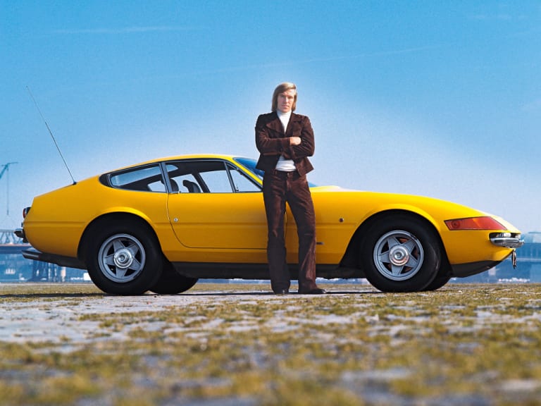 Le footballeur allemand Günter Netzer pose aux cotés de la Ferrari 365 GTB/4 « Daytona » Ainsi, le V12 qui allait motoriser la nouvelle GT 2 places de la marque datait du début des années 50. Bien sûr, le “Colombo” avait évolué depuis, passant à 4,4 litres d’où le nom de la voiture, sa cylindrée unitaire : 365 GTB/4. Désormais, il développait 352 chevaux, un chiffre conséquent à l’époque. A l’ancienne, la 365 GTB/4 s’offrait un châssis tubulaire sur lequel était “posée” la carrosserie, mais elle reprenait l’innovation de la 275 GTB/4 avec un moteur reculé le plus possible tandis que la boîte de vitesses et le différentiel trouvaient leur place à l’arrière. Une solution que l’on retrouvera chez Porsche sur ses 924/928/944/968 sous le nom de Transaxle et permettait un excellent équilibre de l’auto.