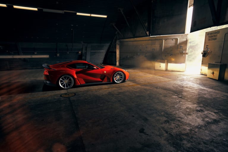 Par la suite, le duo constitué des 612 Scaglietti et 599 GTB se chargea de prolonger cette répartition des rôles, avant que la stratégie de Ferrari n’évolue radicalement au début des années 2010, donnant respectivement naissance au break de chasse FF et à la F12berlinetta, présentée au printemps 2012. Celle-ci reprenait le principe du moteur central avant, inauguré par la 599, ainsi que les substrats de son moteur – il s’agissait, cette fois encore, du V12 tipo F140, poussé à 6,3 litres pour une puissance de 740 ch. Sur le plan esthétique, l’auto marquait une nette rupture avec sa devancière, étant la première Ferrari de route à moteur V12 dessinée – avec, certes, la collaboration de Pininfarina – par le bureau de style maison. Aucune esbroufe, aucun geste gratuit dans ce dessin tout entier tourné vers la quête de l’efficience aérodynamique, avec ce capot et ces ailes avant copieusement creusés, permettant de guider les flux d’air et de générer ainsi une portance négative, participant ainsi à la stabilité de l’engin à haute vitesse. Pour sa part, la construction tout alu, dite space frame, avec une structure tubulaire utilisant douze alliages d’aluminium différents, contient le poids à seulement 1630 kilos, d’où des chronos qui, même douze ans après, laissent rêveur : plus de 340 km/h en pointe, le 0 à 100 km/h en 3,1 secondes, le 0 à 200 en 8,5 secondes !