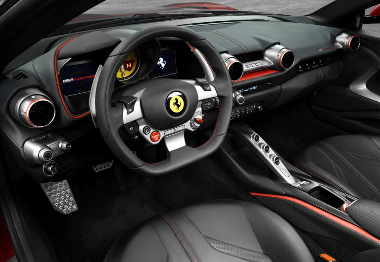 Pourtant, l’auto ne vivra que cinq ans avant d’être remplacée, dès 2017, par la 812 Superfast – un suffixe qui n’avait plus été utilisé depuis la très confidentielle 500 Superfast, construite de 1964 à 1966. Depuis de longues années, Ferrari aime cultiver l’ambiguïté quant à la dénomination de ses modèles ; souvent, un changement d’appellation ne correspond qu’à un restylage plus ou moins significatif, accompagné d’une profonde mise à jour technique, à l’instar des 458 Italia, 488 GTB puis F8 Tributo. Est-ce le cas de la 812 par rapport à la F12 ? Revu et corrigé par les stylistes Ferrari, le design ne déconcerte pas les propriétaires de l’ancien modèle ; la 812 améliore encore son package aérodynamique et – ce qui n’est pas du goût de tous – affiche des détails esthétiques censés renforcer son agressivité, s’éloignant délibérément de l’élégance mâtinée de technologie qui caractérisait la F12. Vue de l’arrière en particulier, l’auto s’avère encore plus impressionnante que sa devancière, tandis que la puissance du V12, qui cube à présent 6496 cm3, progresse encore pour atteindre les 800 ch à 8500 tours/minute, le couple culminant pour sa part à 718 Nm, atteints à 7000 tours. De quoi reprendre le large vis-à-vis de la Lamborghini Aventador…