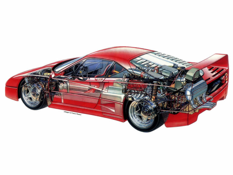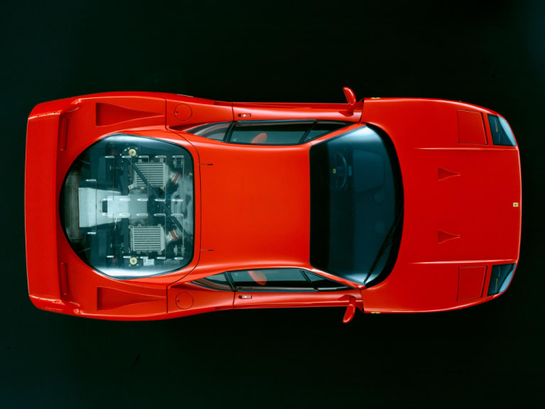 En 1988, les deux compères s’exprimèrent longuement dans la revue italienne Auto In. Fioravanti abordait ainsi la question du Cx de la F40, égal à 0,34 : « Il s’agit d’une valeur intéressante pour une voiture ayant des dimensions transversales considérables et extrêmement tourmentées : roues énormes, prises d’air multiples pour les radiateurs à eau et à huile, les freins et les échangeurs de température (…) On peut le comparer à celui d’une voiture de course et le rattacher aux exigences primordiales d’un moteur biturbo à huit radiateurs, avide d’air, et à l’autre exigence primordiale qui consiste à maintenir la voiture sur la route avec une sécurité active. » Davantage préoccupé par l’efficacité que par l’émotion esthétique, le travail du carrossier a pourtant abouti à un design saisissant qui, aujourd’hui encore, empoigne votre imaginaire pour ne plus le lâcher.