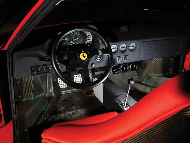 La seule concession au confort concerne l’air conditionné ; pour le reste, les vitres latérales coulissantes en lexan, l’insonorisation minimaliste, les baquets de compétition et la dureté générale des commandes ne forcent pas le trait : la F40 n’est pas faite pour voyager et ce n’est pas non plus une automobile de plaisance, comme en témoignent l’absence d’assistance de direction et de freinage — ne parlons même pas de l’ABS… — ou la possibilité de l’équiper d’une boîte de vitesses à crabots. À son volant, les kilomètres que vous dévorez se suffisent à eux-mêmes : il ne s’agit pas de se déplacer mais de rouer sans but précis, dans la stridence du huit-cylindres et le concert mi-ordonné, mi-aléatoire des résonances mécaniques. Le regretté Michele Alboreto estimait que la F40 devait être abordée comme une Formule 1, avec la même humilité et la même concentration ; cela en dit long quant à la nature véritable de la voiture.