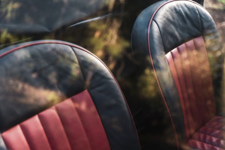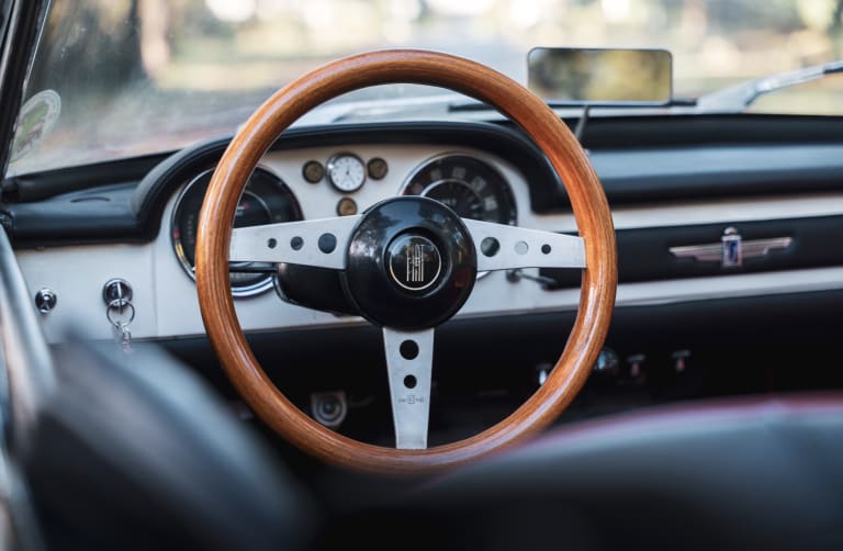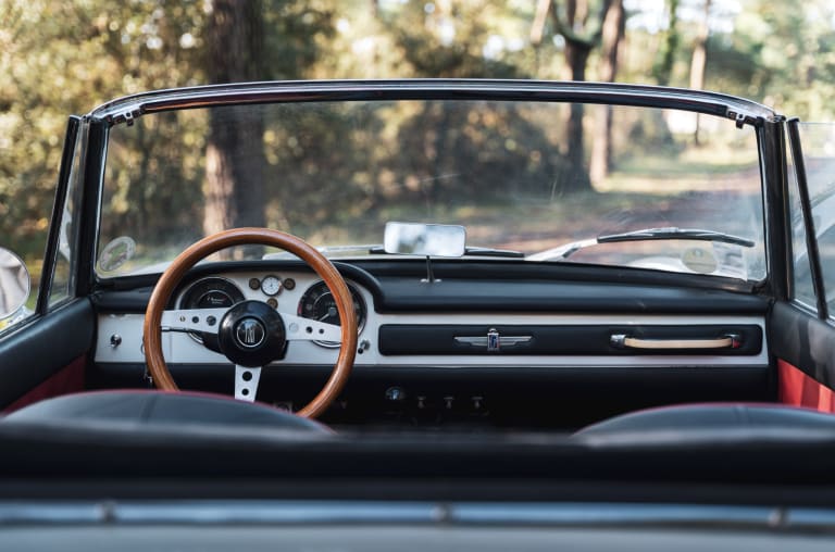 Le contraste entre le cuir noir et rouge crée une atmosphère à la fois sportive et élégante. Les sièges ont été refaits en 2022, ce qui garantit leur confort et leur état impeccable. La planche de bord, épurée mais fonctionnelle, abrite des instruments de bord bien lisibles, dont une horloge centrale qui vient parfaire l’aspect rétro de l’habitacle. Un autoradio, discrètement installé entre les sièges, apporte une touche de modernité à l’ensemble, tout en préservant l’authenticité de l’auto. L’aspect sonore est également soigné avec l’installation d’un klaxon italien, une référence au célèbre Tour de France 1960, pour ajouter une touche d’originalité.