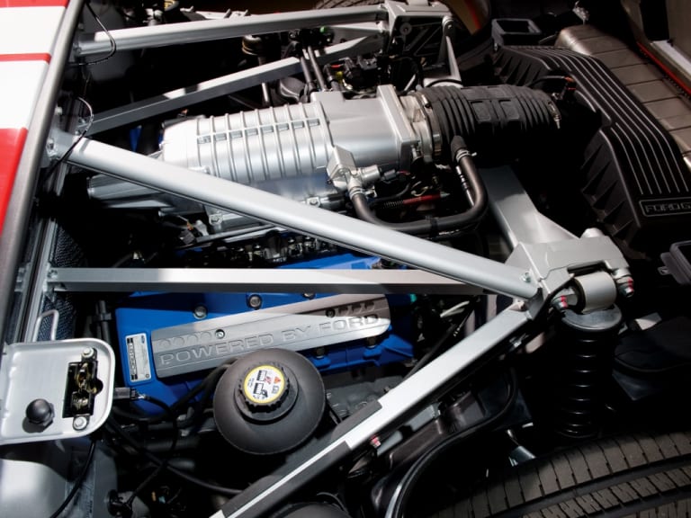 Côté moteur justement, la GT recevait un gros V8 Triton de 5,4 litres à compresseur issu de la Mustang GT500 duquel on avait pu tirer quelques chevaux supplémentaires, atteignant 558 chevaux. Châssis alu, carrosserie mêlant alu, plastique, et carbone, et seulement 1545 kg sur la balance : de quoi profiter du moindre cheval produit par le V8 ! Pas forcément la plus efficace des supercars, ni la plus performantes, mais là n’était pas la vocation de la GT : tout en elle rappelle l’Amérique, son aïeule, la force brutale, et vous ôte l’envie de la comparer.