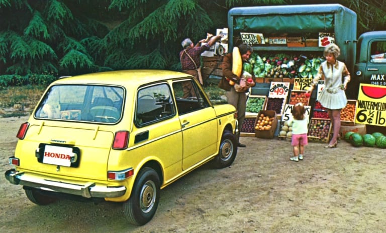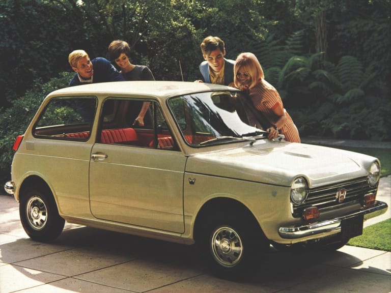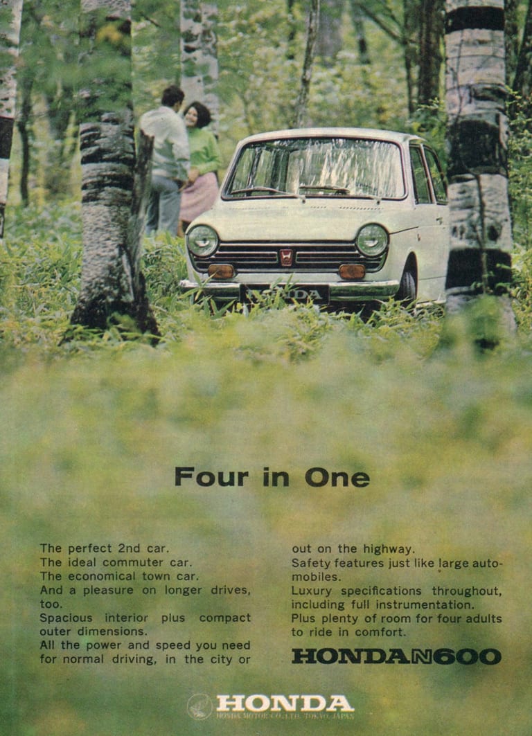 Honda avait présenté sa N360 au Salon de Tokyo en 1966, au bicylindre quatre temps de 356 cm3 donnant 31 ch. La N360 reste la matrice de la N600, les deux sous le même habillage ouvrant la série automobile passant en 1970 à l’originale Z600 à la lunette arrière-écran jusqu’à la presqu’acronyme Civic de 1972 qui ne cessa de croître et pas toujours embellir, voire jusqu’à la lointaine Jazz sortie en 2001. Honda est alors un jeune constructeur automobile entré dans cette arène industrielle et dans celle de la Formule 1 l’année d’avant les J.O. de Tokyo de 1964, continuant son triomphe motocycliste. La conjugaison de l’équipement automobile du pays, alors en pleine prospérité ascendante, avec l’expérience de la sophistication victorieuse en motocyclisme et la métropolisation contraignante font la base de la production automobile Honda. Les S600 de 1964-1966, aux roues entraînées par chaîne comme une moto, devenues S800 en 1966-1970, portaient la notoriété prometteuse de Honda en automobile. En 1965, le Japon n’est pas entré dans la massification automobile puisque moins de 6 % de sa population en sont équipés et les Kei-cars constituent le gros des troupes. Le Japon produit, en 1965, un peu plus de 696 000 autos, chiffre multiplié par 4,5 en 1970, à près de 3,2 millions d’autos produites, dépassant l’industrie française qui ne rejoindra ce score qu’en 1980.