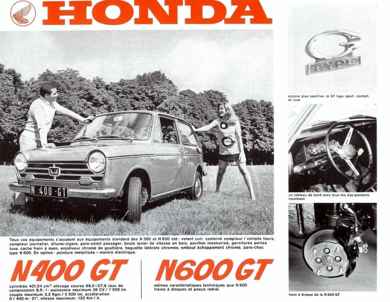 Lorsque le constructeur Honda aborde l’automobile quotidienne, dans les années 60, il est porté par la gloire motocycliste et s‘engage en Formule 1. Honda, c’est alors soit le bicylindre furieux de la moto RC 116 49,77 cm3, soit le V12 2 991 cm3 de la RA273 de F1. Entre les deux, la pépite S800 fait saliver l’automobiliste ouest-européen. Mais, l’auto de service n’a pas dit son dernier mot pour autant. La N600, véhicule avant tout à vocation urbaine, associe compacité et habitabilité, puissance et vivacité, modernité technique et jeunesse d’esprit. Bref, elle est bien dans l’air du temps, une sorte d’auto très Dim Dam Dom.