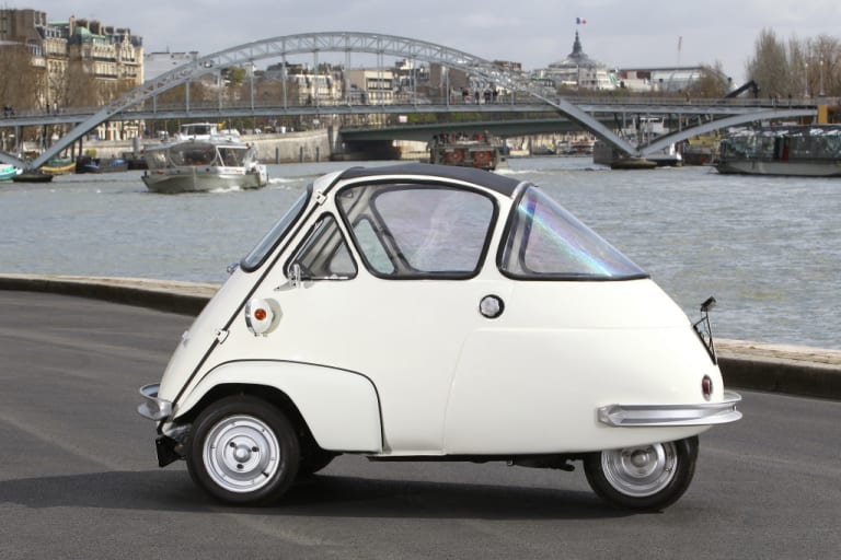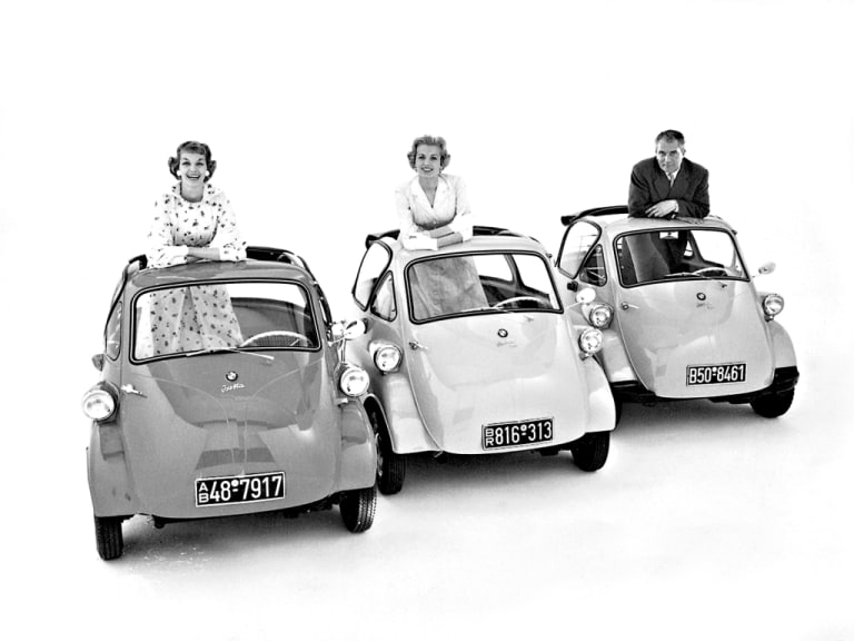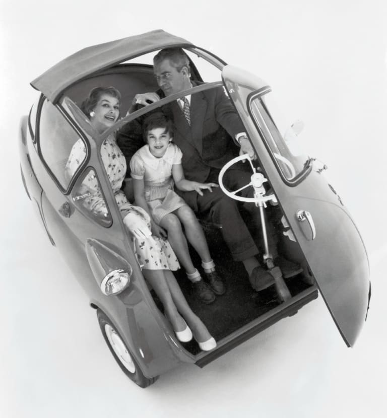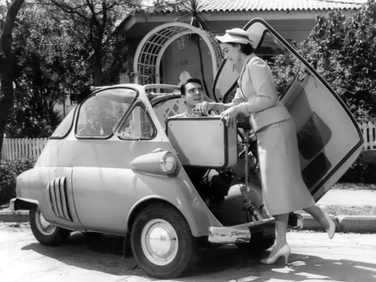 Cette décennie voit donc émerger des constructeurs “différents” proposant ce qu’on appelle en Angleterre des Cyclecars, en particulier Messerschmitt qui lance en 1952 son KR175, un drôle d’engin profilé comme un avion pouvant transporter deux personnes. BMW comprend vite l’intérêt qu’elle peut trouver en achetant une licence de fabrication de l’Isetta auprès d’ISO. Aussitôt dit aussitôt fait, et la marque de Munich lance la BMW Isetta dès 1954 et, contre toute attente, avec succès.