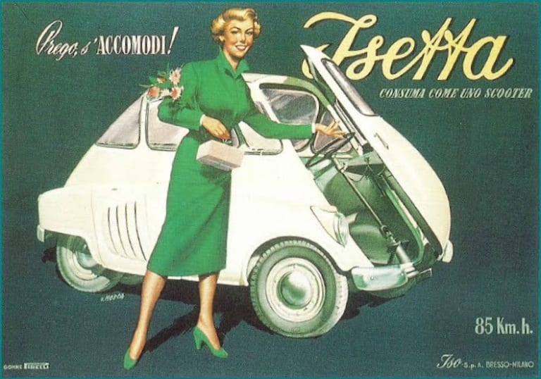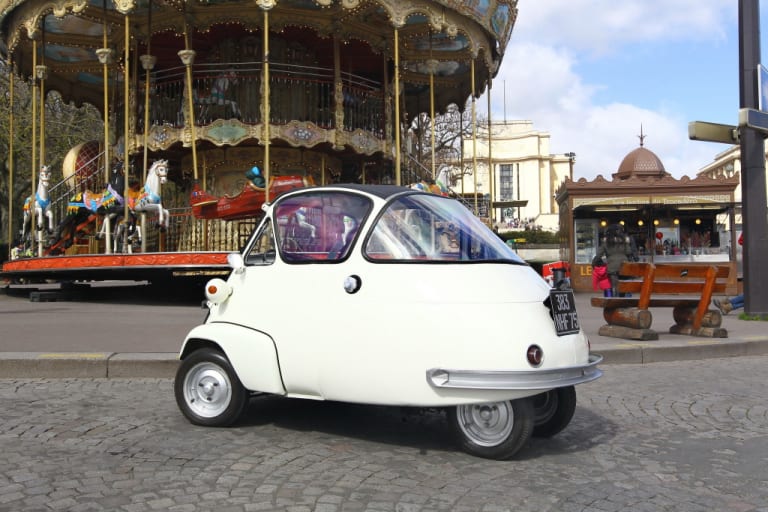 Difficile d’imaginer une voiture plus internationale que la petite Isetta, solution de transport bon marché à mi-chemin entre la moto et l’automobile, avec sa gueule d’oeuf ou de pot de yaourt (oui le pot de yaourt, initialement, c’est elle et non la Fiat 500), c’est selon. Conçue en Italie (par ISO, d’où son nom, Isetta voulant dire “petite ISO”), fabriquée en France (Velam), au Brésil (Romi Isetta), en Allemagne (BMW) et en Angleterre (par la filiale locale de BMW), l’Isetta marquera la décennie à une époque où les moyens financiers des familles n’étaient pas toujours raccord avec leurs besoins de déplacements. Retour sur cette drôle d’histoire !